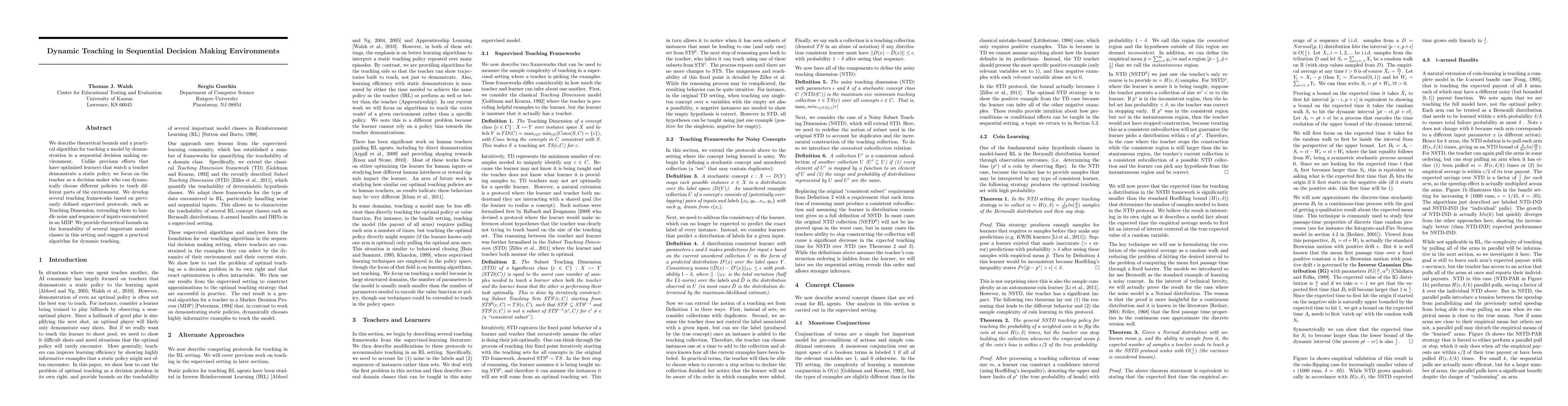 This paper presents theoretical bounds and a practical algorithm for teaching models through dynamic demonstrations in sequential decision-making environments. It focuses on teaching frameworks that allow the teacher to adapt policies dynamically, extending supervised protocols to handle noise and sequences in Markov Decision Processes (MDPs).