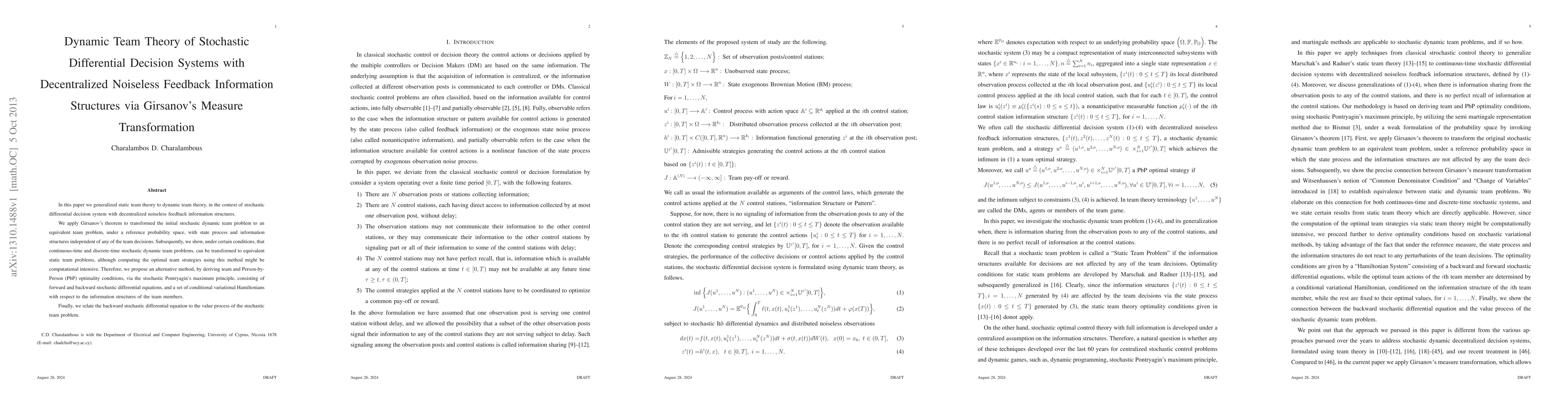 This paper extends static team theory to dynamic team theory for stochastic differential decision systems with decentralized noiseless feedback. It utilizes Girsanov's measure transformation to convert dynamic problems into equivalent static ones, leveraging the stochastic Pontryagin's maximum principle for optimal strategy derivation, despite computational challenges.