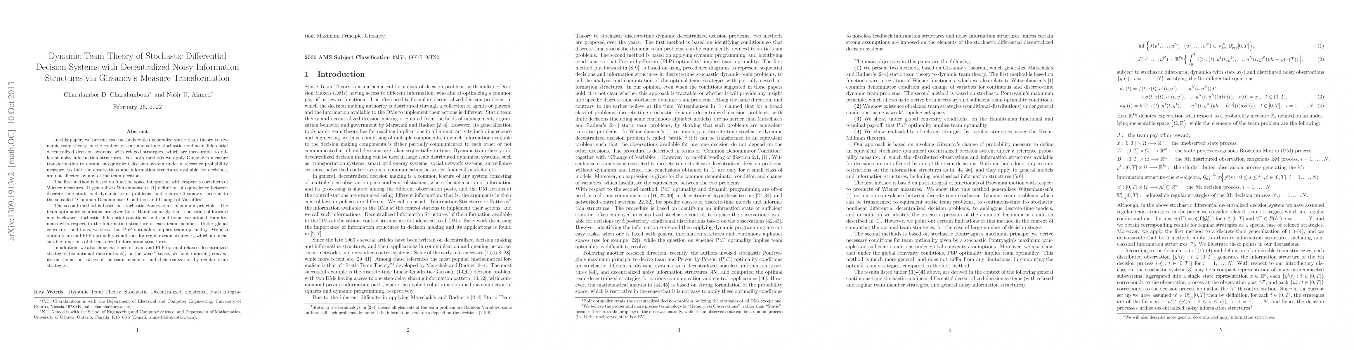 In this paper, we present two methods which generalize static team theory to dynamic team theory, in the context of continuous-time stochastic nonlinear differential decentralized decision systems, with relaxed strategies, which are measurable to different noisy information structures. For both methods we apply Girsanov's measure transformation to obtain an equivalent dynamic team problem under a reference probability measure, so that the observations and information structures available for decisions, are not affected by any of the team decisions. The first method is based on function space integration with respect to products of Wiener measures, and generalizes Witsenhausen's [1] definition of equivalence between discrete-time static and dynamic team problems. The second method is based on stochastic Pontryagin's maximum principle. The team optimality conditions are given by a "Hamiltonian System" consisting of forward and backward stochastic differential equations, and a conditional variational Hamiltonian with respect to the information structure of each team member, expressed under the initial and a reference probability space via Girsanov's measure transformation. Under global convexity conditions, we show that that PbP optimality implies team optimality. In addition, we also show existence of team and PbP optimal relaxed decentralized strategies (conditional distributions), in the weak$^*$ sense, without imposing convexity on the action spaces of the team members. Moreover, using the embedding of regular strategies into relaxed strategies, we also obtain team and PbP optimality conditions for regular team strategies, which are measurable functions of decentralized information structures, and we use the Krein-Millman theorem to show realizability of relaxed strategies by regular strategies.