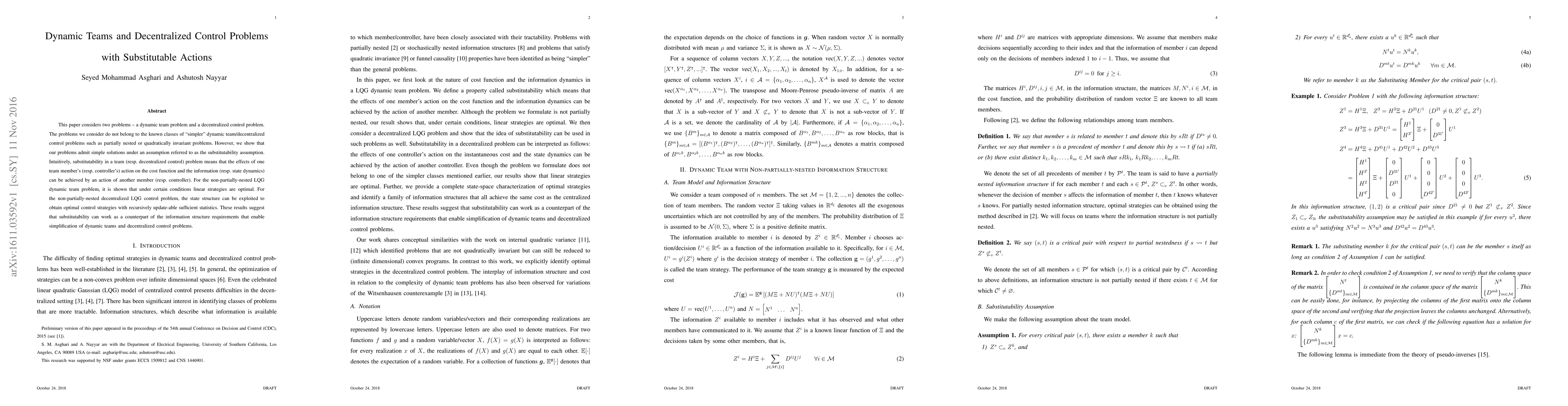 This paper addresses dynamic team and decentralized control problems without traditional simplifying assumptions, demonstrating that substitutability allows for optimal linear strategies and recursively update-able sufficient statistics under certain conditions.