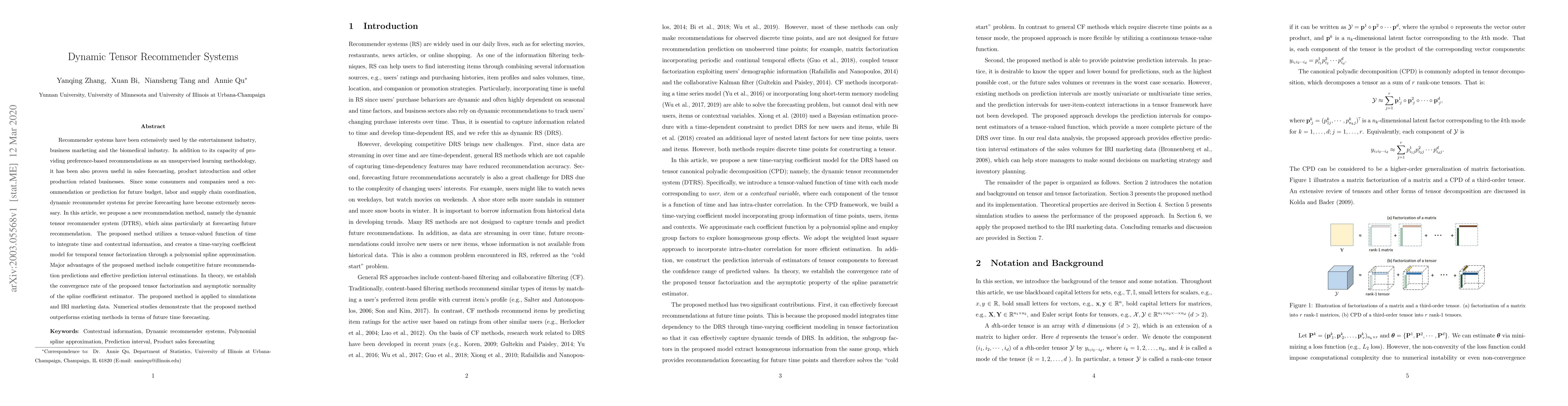 Recommender systems have been extensively used by the entertainment industry, business marketing and the biomedical industry. In addition to its capacity of providing preference-based recommendations as an unsupervised learning methodology, it has been also proven useful in sales forecasting, product introduction and other production related businesses. Since some consumers and companies need a recommendation or prediction for future budget, labor and supply chain coordination, dynamic recommender systems for precise forecasting have become extremely necessary. In this article, we propose a new recommendation method, namely the dynamic tensor recommender system (DTRS), which aims particularly at forecasting future recommendation. The proposed method utilizes a tensor-valued function of time to integrate time and contextual information, and creates a time-varying coefficient model for temporal tensor factorization through a polynomial spline approximation. Major advantages of the proposed method include competitive future recommendation predictions and effective prediction interval estimations. In theory, we establish the convergence rate of the proposed tensor factorization and asymptotic normality of the spline coefficient estimator. The proposed method is applied to simulations and IRI marketing data. Numerical studies demonstrate that the proposed method outperforms existing methods in terms of future time forecasting.