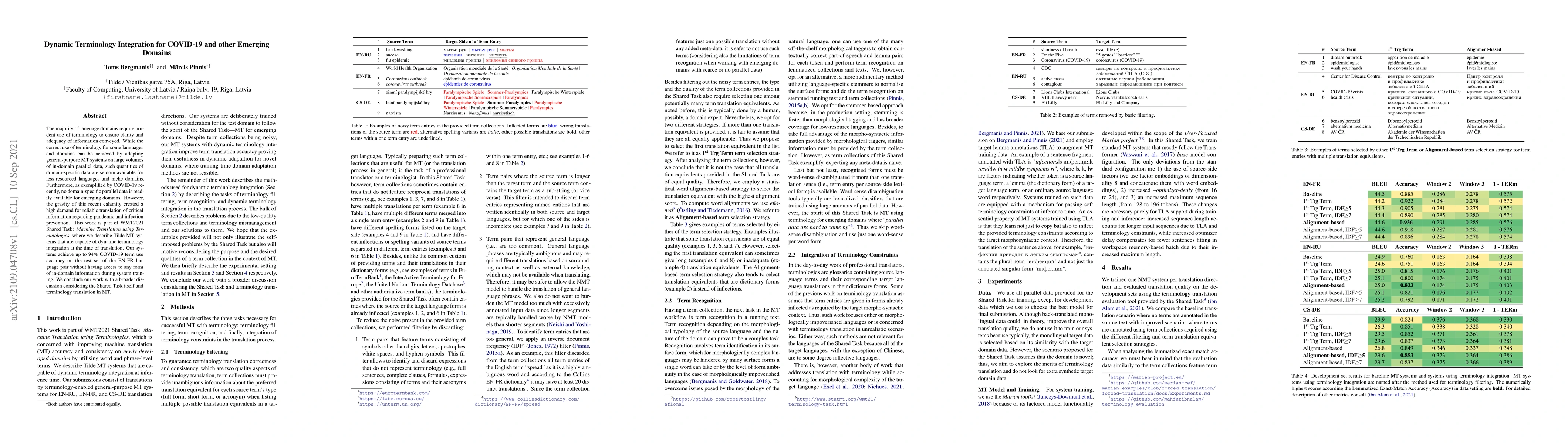 This paper presents Tilde MT systems that dynamically integrate terminology for translating critical COVID-19 information, achieving 94% term use accuracy in EN-FR without in-domain training data. The study highlights the challenges of terminology adaptation for less-resourced languages and emerging domains.