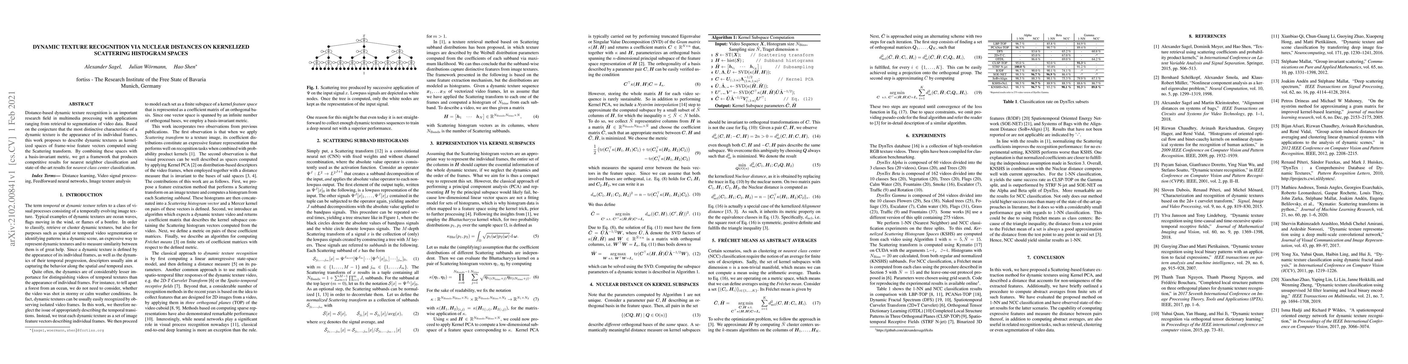 This paper proposes a method for dynamic texture recognition using kernelized scattering histograms and nuclear distances, achieving competitive nearest neighbor classification and state-of-the-art results for nearest class center classification. The approach leverages frame-wise features from the Scattering transform in kernelized feature spaces.