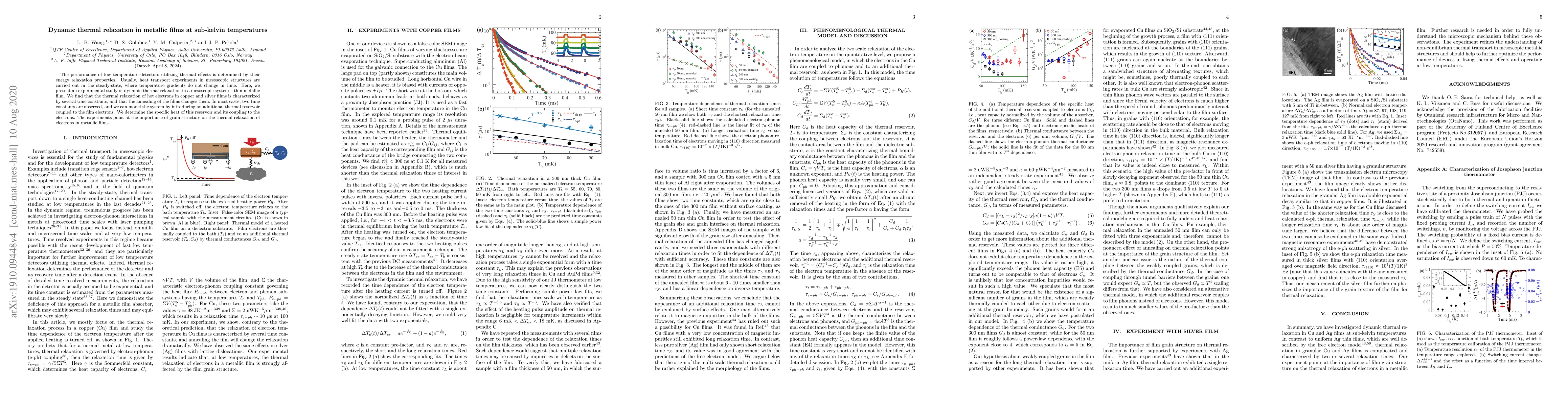 This paper investigates dynamic thermal relaxation in thin metallic films at sub-kelvin temperatures, revealing multiple time constants for electron relaxation influenced by grain structure. The study models the system with an additional thermal reservoir, determining its specific heat and coupling to electrons.