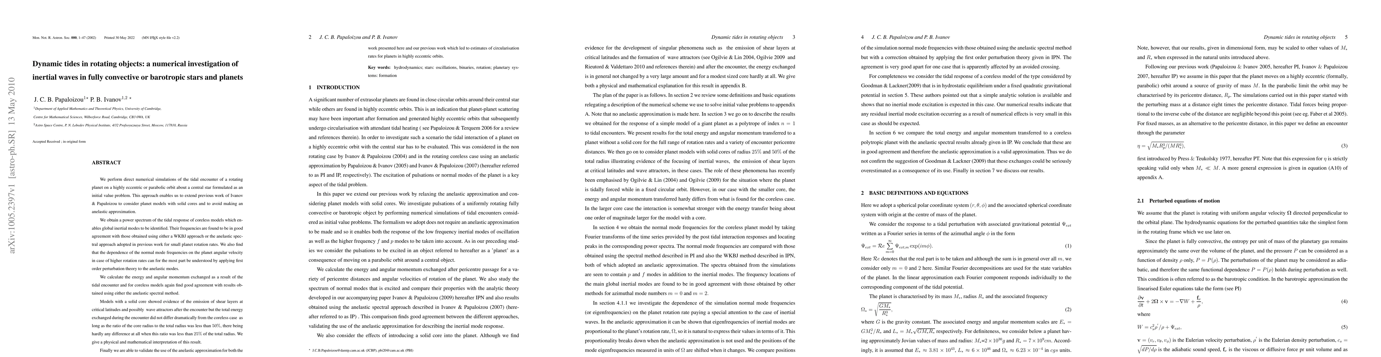 We perform direct numerical simulations of the tidal encounter of a rotating planet on a highly eccentric or parabolic orbit about a central star formulated as an initial value problem. This approach enables us to extend previous work of Ivanov & Papaloizou to consider planet models with solid cores and to avoid making an anelastic approximation. We obtain a power spectrum of the tidal response of coreless models which enables global inertial modes to be identified. Their frequencies are found to be in good agreement with those obtained using either a WKBJ approach or the anelastic spectral approach adopted in previous work for small planet rotation rates. We also find that the dependence of the normal mode frequencies on the planet angular velocity in case of higher rotation rates can for the most part be understood by applying first order perturbation theory to the anelastic modes. We calculate the energy and angular momentum exchanged as a result of the tidal encounter and for coreless models again find good agreement with results obtained using either the anelastic spectral method. Models with a solid core showed evidence of the emission of shear layers at critical latitudes and possibly wave attractors after the encounter but the total energy exchanged during the encounter did not differ dramatically from the coreless case as long as the ratio of the core radius to the total radius was less than 50%, there being hardly any difference at all when this ratio was less than 25% of the total radius. We give a physical and mathematical interpretation of this result. Finally we are able to validate the use of the anelastic approximation for both the work presented here and our previous work which led to estimates of circularisation rates for planets in highly eccentric orbits.