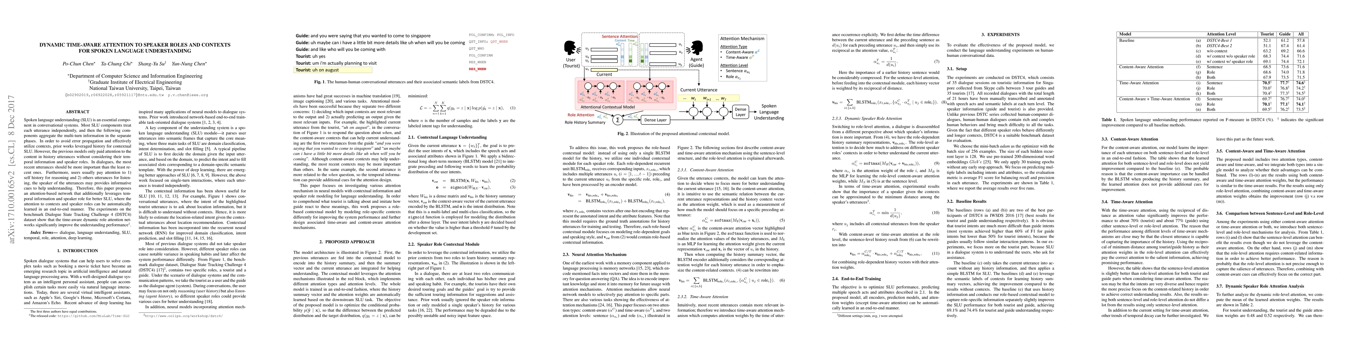 This paper proposes a dynamic time-aware attention network to enhance spoken language understanding by incorporating temporal information and speaker roles, leading to improved performance on the DSTC4 dataset. The model effectively learns context and speaker role attention in an end-to-end manner, reducing error propagation and better utilizing dialogue history.