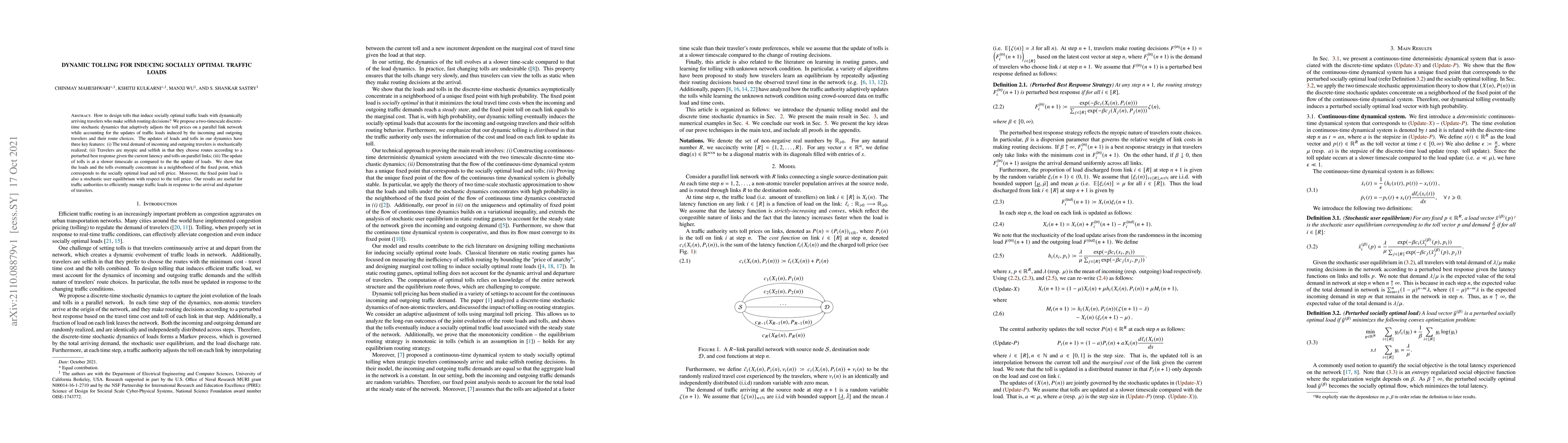 How to design tolls that induce socially optimal traffic loads with dynamically arriving travelers who make selfish routing decisions? We propose a two-timescale discrete-time stochastic dynamics that adaptively adjusts the toll prices on a parallel link network while accounting for the updates of traffic loads induced by the incoming and outgoing travelers and their route choices. The updates of loads and tolls in our dynamics have three key features: (i) The total demand of incoming and outgoing travelers is stochastically realized; (ii) Travelers are myopic and selfish in that they choose routes according to a perturbed best response given the current latency and tolls on parallel links; (iii) The update of tolls is at a slower timescale as compared to the the update of loads. We show that the loads and the tolls eventually concentrate in a neighborhood of the fixed point, which corresponds to the socially optimal load and toll price. Moreover, the fixed point load is also a stochastic user equilibrium with respect to the toll price. Our results are useful for traffic authorities to efficiently manage traffic loads in response to the arrival and departure of travelers.