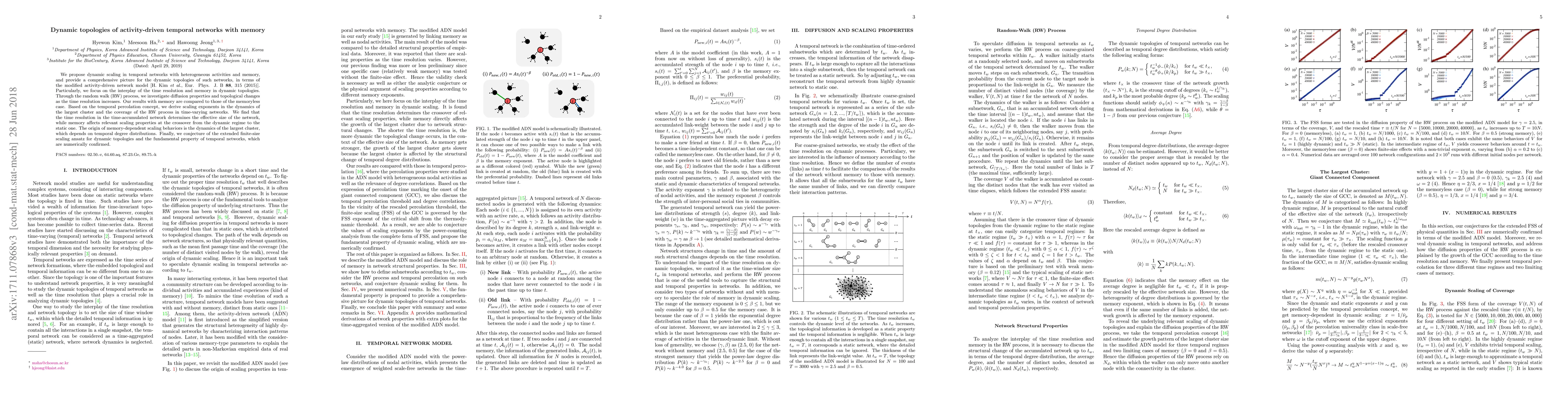 We propose dynamic scaling in temporal networks with heterogeneous activities and memory, and provide a comprehensive picture for the dynamic topologies of such networks, in terms of the modified activity-driven network model [H. Kim \textit{et al.}, Eur. Phys. J. B {\bf 88}, 315 (2015)]. Particularly, we focus on the interplay of the time resolution and memory in dynamic topologies. Through the random walk (RW) process, we investigate diffusion properties and topological changes as the time resolution increases. Our results with memory are compared to those of the memoryless case. Based on the temporal percolation concept, we derive scaling exponents in the dynamics of the largest cluster and the coverage of the RW process in time-varying networks. We find that the time resolution in the time-accumulated network determines the effective size of the network, while memory affects relevant scaling properties at the crossover from the dynamic regime to the static one. The origin of memory-dependent scaling behaviors is the dynamics of the largest cluster, which depends on temporal degree distributions. Finally, we conjecture of the extended finite-size scaling ansatz for dynamic topologies and the fundamental property of temporal networks, which are numerically confirmed.