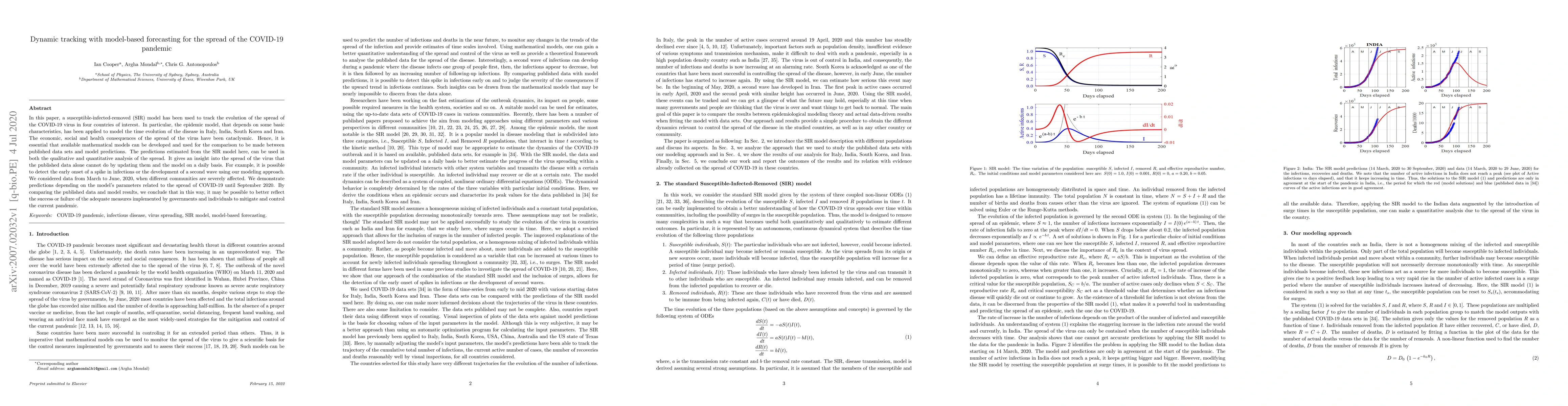 In this paper, a susceptible-infected-removed (SIR) model has been used to track the evolution of the spread of the COVID-19 virus in four countries of interest. In particular, the epidemic model, that depends on some basic characteristics, has been applied to model the time evolution of the disease in Italy, India, South Korea and Iran. The economic, social and health consequences of the spread of the virus have been cataclysmic. Hence, it is essential that available mathematical models can be developed and used for the comparison to be made between published data sets and model predictions. The predictions estimated from the SIR model here, can be used in both the qualitative and quantitative analysis of the spread. It gives an insight into the spread of the virus that the published data alone cannot do by updating them and the model on a daily basis. For example, it is possible to detect the early onset of a spike in infections or the development of a second wave using our modeling approach. We considered data from March to June, 2020, when different communities are severely affected. We demonstrate predictions depending on the model's parameters related to the spread of COVID-19 until September 2020. By comparing the published data and model results, we conclude that in this way, it may be possible to better reflect the success or failure of the adequate measures implemented by governments and individuals to mitigate and control the current pandemic.