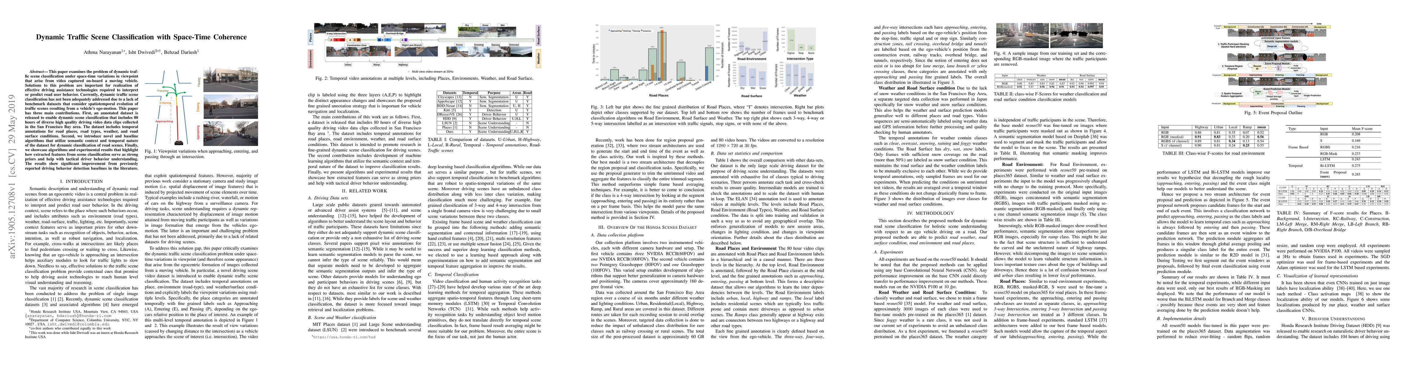 This paper examines the problem of dynamic traffic scene classification under space-time variations in viewpoint that arise from video captured on-board a moving vehicle. Solutions to this problem are important for realization of effective driving assistance technologies required to interpret or predict road user behavior. Currently, dynamic traffic scene classification has not been adequately addressed due to a lack of benchmark datasets that consider spatiotemporal evolution of traffic scenes resulting from a vehicle's ego-motion. This paper has three main contributions. First, an annotated dataset is released to enable dynamic scene classification that includes 80 hours of diverse high quality driving video data clips collected in the San Francisco Bay area. The dataset includes temporal annotations for road places, road types, weather, and road surface conditions. Second, we introduce novel and baseline algorithms that utilize semantic context and temporal nature of the dataset for dynamic classification of road scenes. Finally, we showcase algorithms and experimental results that highlight how extracted features from scene classification serve as strong priors and help with tactical driver behavior understanding. The results show significant improvement from previously reported driving behavior detection baselines in the literature.
