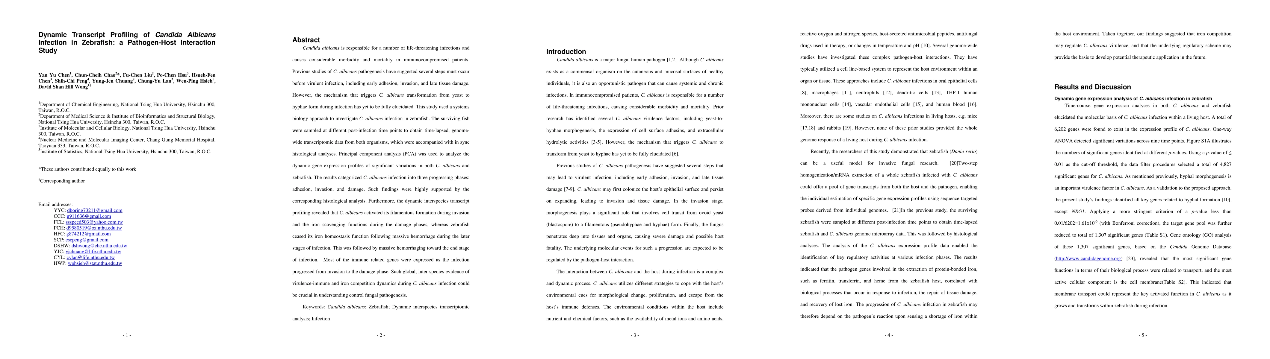 Candida albicans is responsible for a number of life-threatening infections and causes considerable morbidity and mortality in immunocompromised patients. Previous studies of C. albicans pathogenesis have suggested several steps must occur before virulent infection, including early adhesion, invasion, and late tissue damage. However, the mechanism that triggers C. albicans transformation from yeast to hyphae form during infection has yet to be fully elucidated. This study used a systems biology approach to investigate C. albicans infection in zebrafish. The surviving fish were sampled at different post-infection time points to obtain time-lapsed, genome-wide transcriptomic data from both organisms, which were accompanied with in sync histological analyses. Principal component analysis (PCA) was used to analyze the dynamic gene expression profiles of significant variations in both C. albicans and zebrafish. The results categorized C. albicans infection into three progressing phases: adhesion, invasion, and damage. Such findings were highly supported by the corresponding histological analysis. Furthermore, the dynamic interspecies transcript profiling revealed that C. albicans activated its filamentous formation during invasion and the iron scavenging functions during the damage phases, whereas zebrafish ceased its iron homeostasis function following massive hemorrhage during the later stages of infection. This was followed by massive hemorrhaging toward the end stage of infection. Most of the immune related genes were expressed as the infection progressed from invasion to the damage phase. Such global, inter-species evidence of virulence-immune and iron competition dynamics during C. albicans infection could be crucial in understanding control fungal pathogenesis.