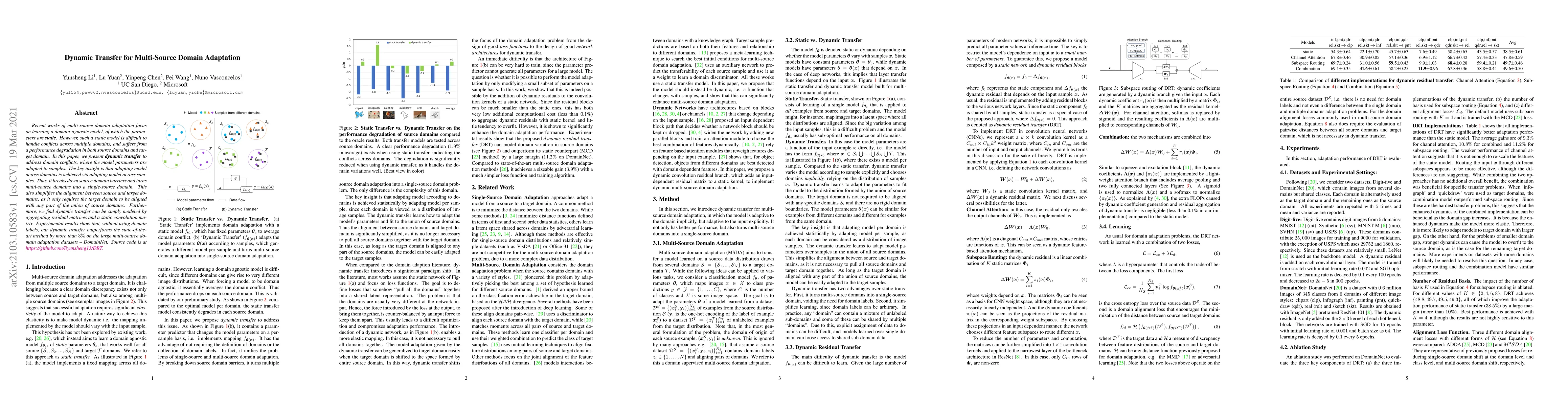 This paper introduces dynamic transfer for multi-source domain adaptation, addressing domain conflicts by adapting model parameters to samples rather than statically. This approach simplifies domain alignment and outperforms state-of-the-art methods on large datasets like DomainNet.