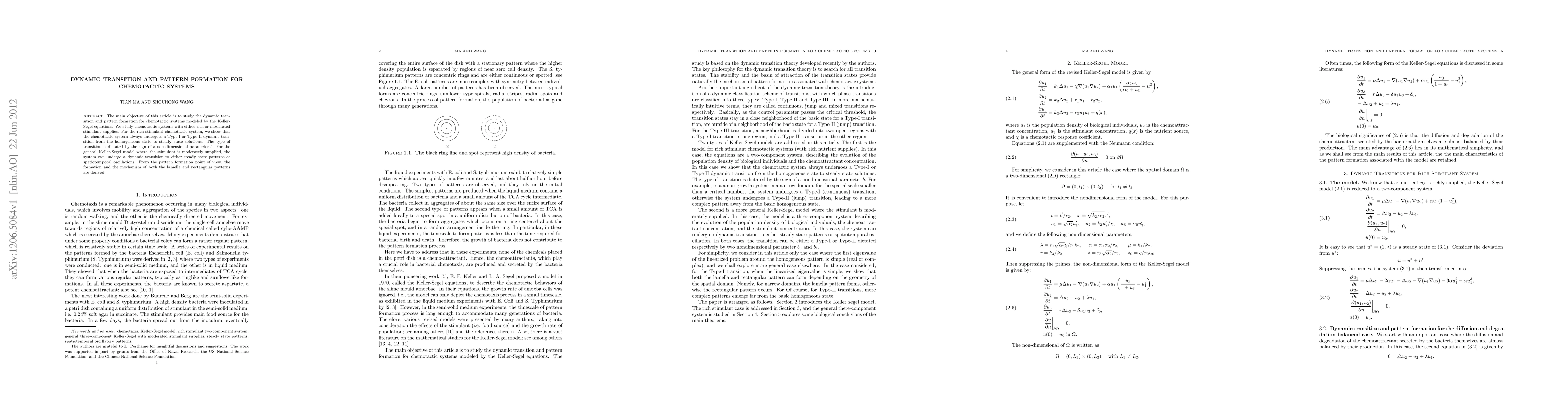The main objective of this article is to study the dynamic transition and pattern formation for chemotactic systems modeled by the Keller-Segel equations. We study chemotactic systems with either rich or moderated stimulant supplies. For the rich stimulant chemotactic system, we show that the chemotactic system always undergoes a Type-I or Type-II dynamic transition from the homogeneous state to steady state solutions. The type of transition is dictated by the sign of a non dimensional parameter $b$. For the general Keller-Segel model where the stimulant is moderately supplied, the system can undergo a dynamic transition to either steady state patterns or spatiotemporal oscillations. From the pattern formation point of view, the formation and the mechanism of both the lamella and rectangular patterns are derived.