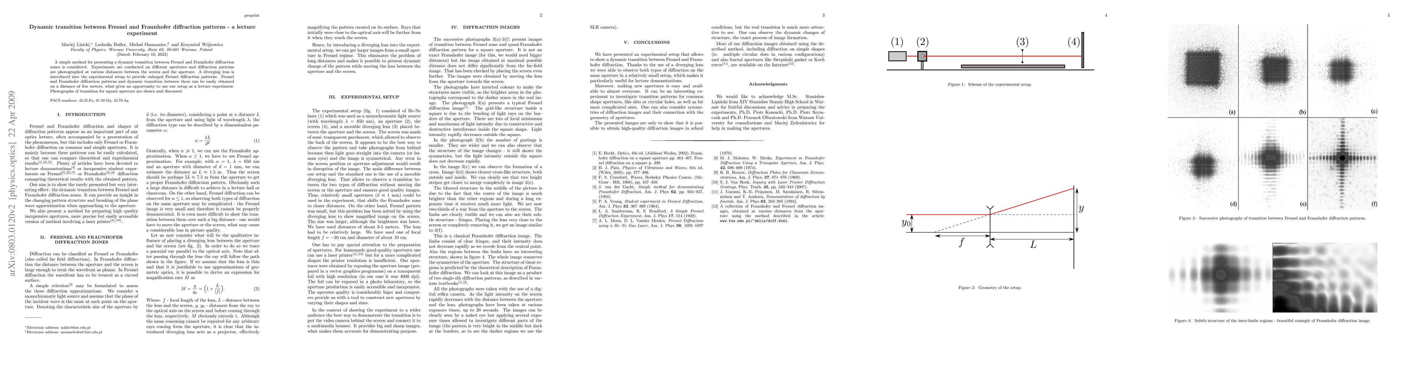 A simple method for presenting a dynamic transition between Fresnel and Fraunhofer diffraction zones is considered. Experiments are conducted on different apertures and diffraction patterns are photographed at various distances between the screen and the aperture. A diverging lens is introduced into the experimental setup to provide enlarged Fresnel diffraction patterns. Fresnel and Fraunhofer diffraction patterns and dynamic transition between them can be easily obtained on a distance of few meters, what gives an opportunity to use our setup as a lecture experiment. Photographs of transition for square aperture are shown and discussed.