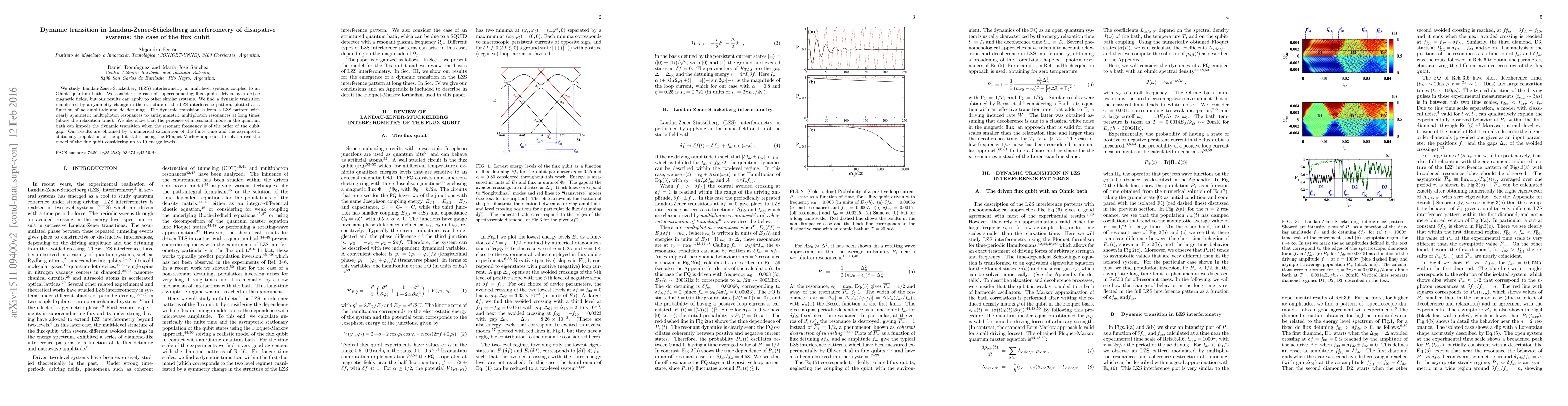 This paper investigates Landau-Zener-Stückelberg interferometry in dissipative multilevel systems, specifically superconducting flux qubits, revealing a dynamic transition in interference patterns due to changes in ac amplitude and dc detuning. The study finds that a resonant mode in the quantum bath can hinder this transition when the resonant frequency is comparable to the qubit gap.