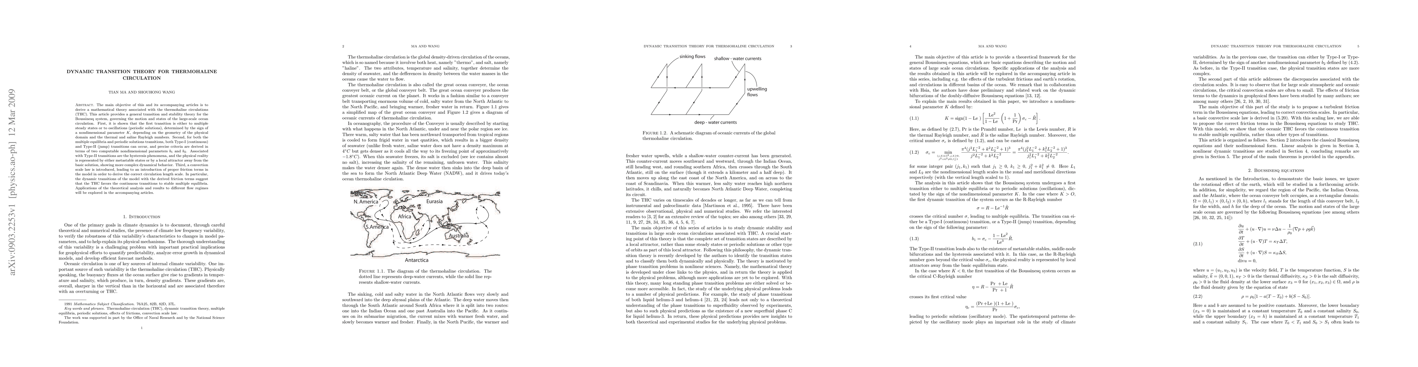 The main objective of this and its accompanying articles is to derive a mathematical theory associated with the thermohaline circulations (THC). This article provides a general transition and stability theory for the Boussinesq system, governing the motion and states of the large-scale ocean circulation. First, it is shown that the first transition is either to multiple steady states or to oscillations (periodic solutions), determined by the sign of a nondimensional parameter $K$, depending on the geometry of the physical domain and the thermal and saline Rayleigh numbers. Second, for both the multiple equilibria and periodic solutions transitions, both Type-I (continuous) and Type-II (jump) transitions can occur, and precise criteria are derived in terms of two computable nondimensional parameters $b_1$ and $b_2$. Associated with Type-II transitions are the hysteresis phenomena, and the physical reality is represented by either metastable states or by a local attractor away from the basic solution, showing more complex dynamical behavior. Third, a convection scale law is introduced, leading to an introduction of proper friction terms in the model in order to derive the correct circulation length scale. In particular, the dynamic transitions of the model with the derived friction terms suggest that the THC favors the continuous transitions to stable multiple equilibria. Applications of the theoretical analysis and results to different flow regimes will be explored in the accompanying articles.