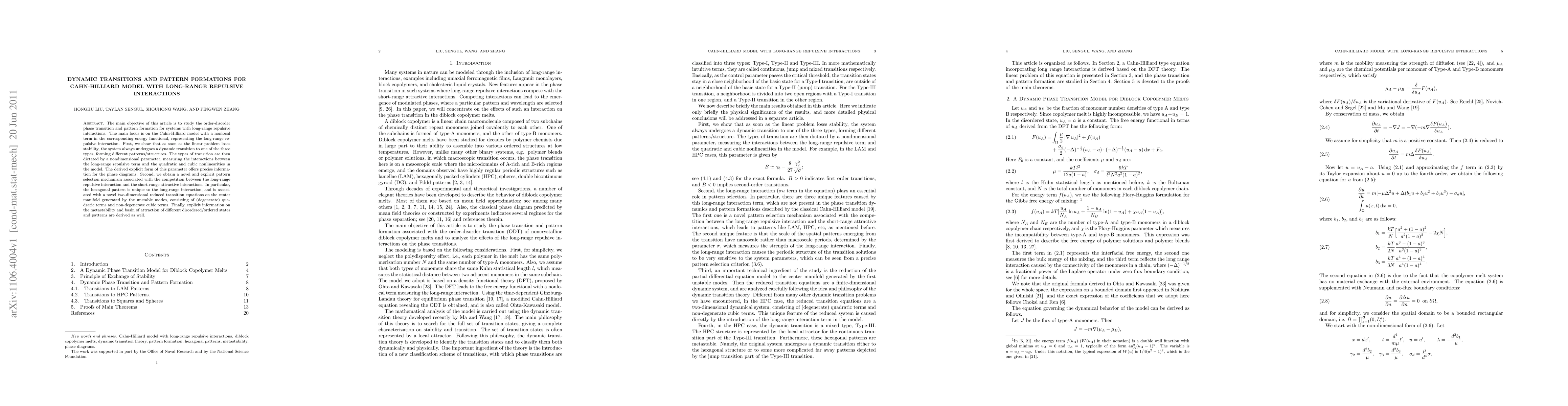 This paper investigates the dynamic transitions and pattern formations in the Cahn-Hilliard model with long-range repulsive interactions, revealing three types of transitions dictated by a nondimensional parameter. It also introduces a novel pattern selection mechanism, particularly highlighting the unique hexagonal pattern linked to a two-dimensional reduced transition equation.