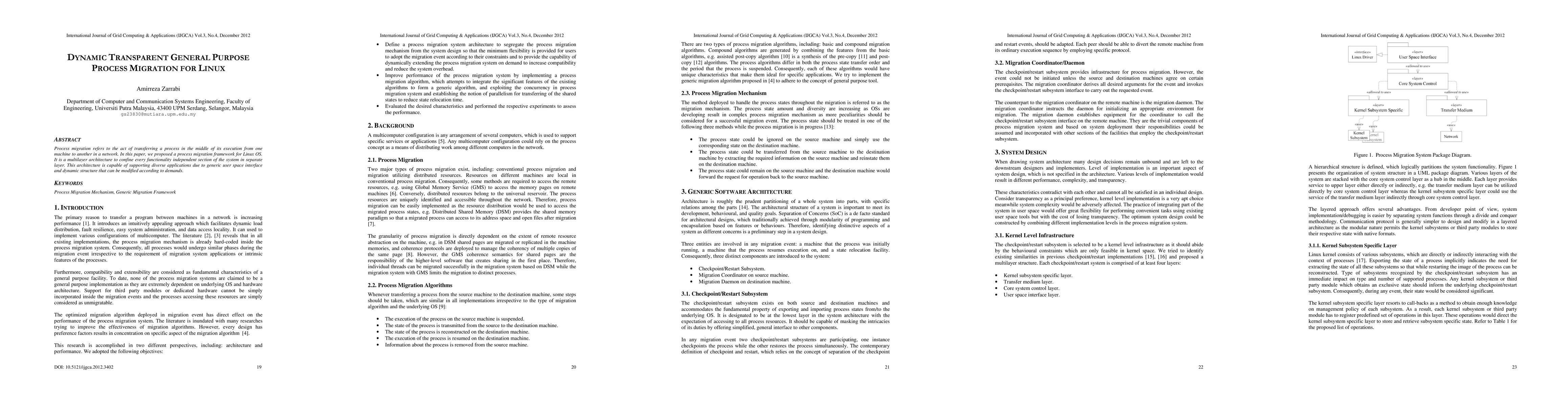 Researchers proposed a Linux OS process migration framework that supports diverse applications with dynamic structure and generic user space interface. The multilayer architecture enables efficient transfer of processes between machines in a network.