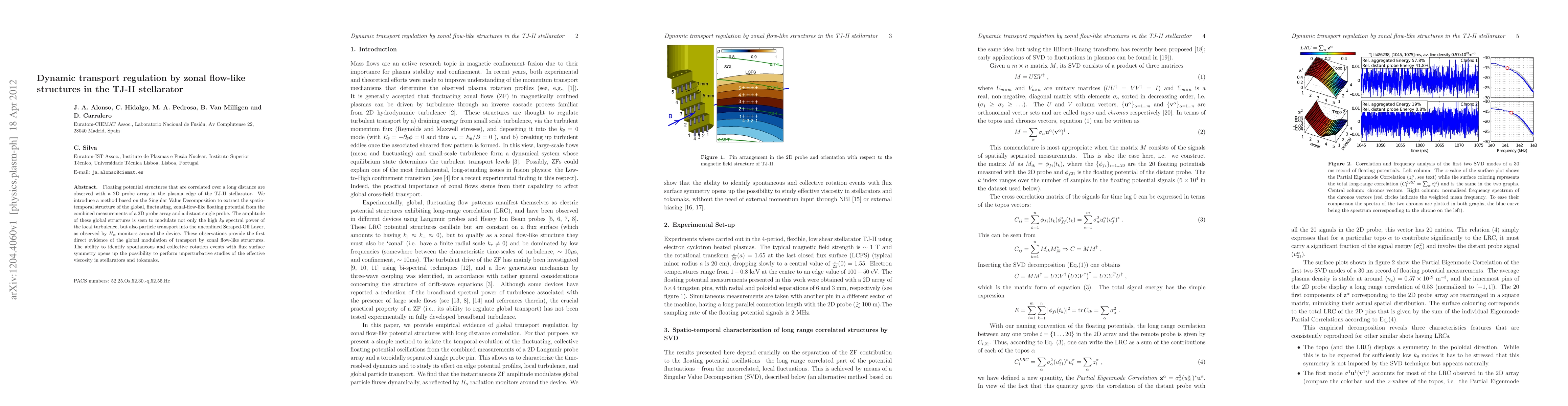This paper investigates long-distance correlated floating potential structures in the TJ-II stellarator's plasma edge, revealing their modulation of local turbulence and particle transport. A novel method using Singular Value Decomposition identifies these zonal flow-like structures, providing direct evidence of their global transport regulation role.