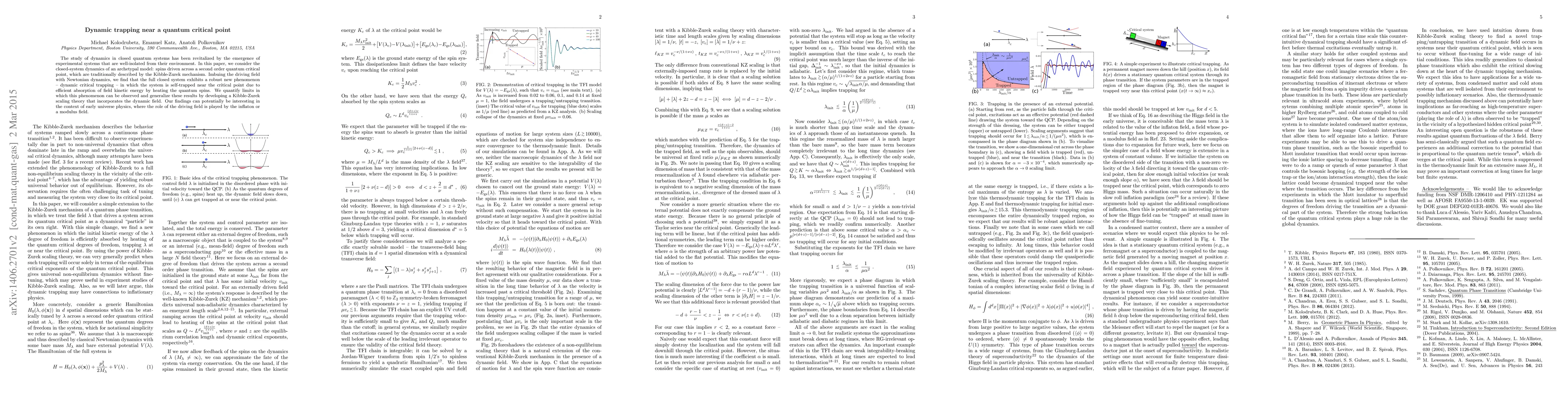 This paper investigates the dynamics of spins near a quantum critical point, revealing a new phenomenon called dynamic critical trapping where the system self-traps near the critical point due to kinetic energy absorption. The study develops a Kibble-Zurek scaling theory for dynamic fields and suggests implications for early universe physics.