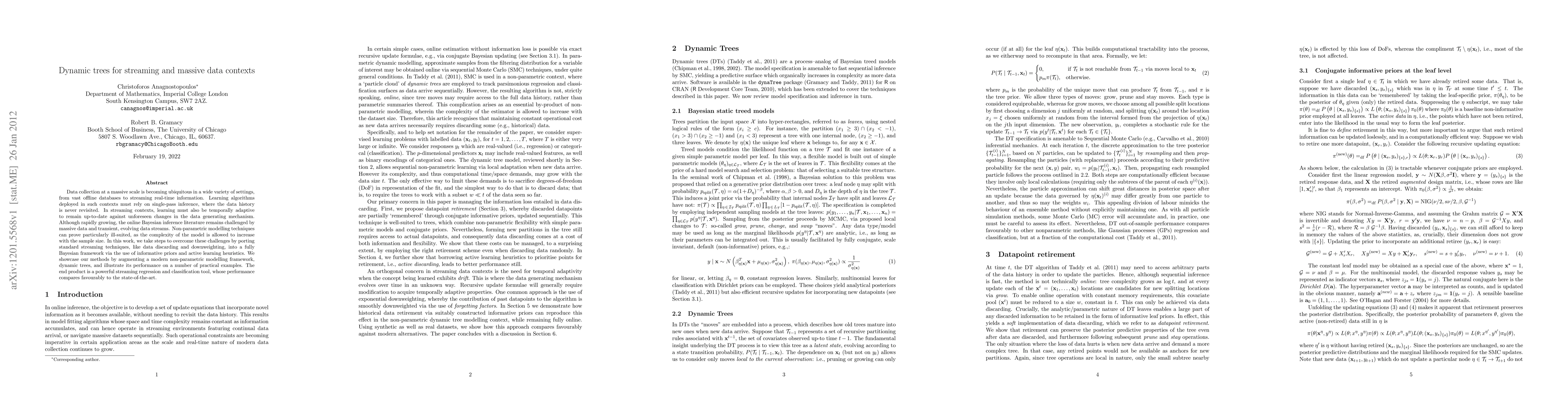 This paper proposes dynamic trees within a Bayesian framework to handle massive and streaming data efficiently, employing techniques like data discarding and downweighting. The approach demonstrates competitive performance on practical examples, offering a robust solution for real-time adaptive learning.