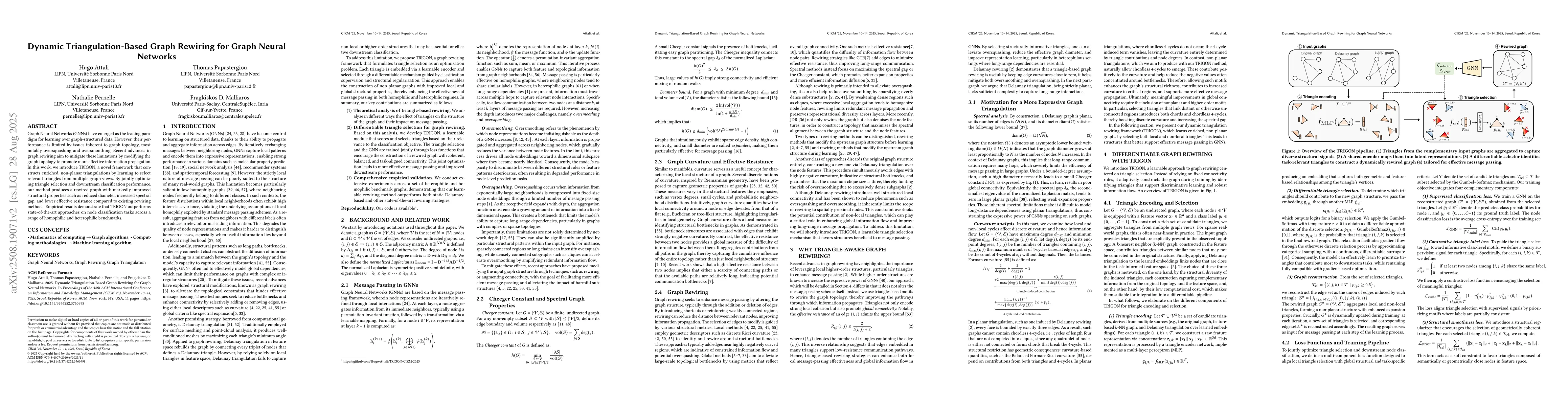 Graph Neural Networks (GNNs) have emerged as the leading paradigm for learning over graph-structured data. However, their performance is limited by issues inherent to graph topology, most notably oversquashing and oversmoothing. Recent advances in graph rewiring aim to mitigate these limitations by modifying the graph topology to promote more effective information propagation. In this work, we introduce TRIGON, a novel framework that constructs enriched, non-planar triangulations by learning to select relevant triangles from multiple graph views. By jointly optimizing triangle selection and downstream classification performance, our method produces a rewired graph with markedly improved structural properties such as reduced diameter, increased spectral gap, and lower effective resistance compared to existing rewiring methods. Empirical results demonstrate that TRIGON outperforms state-of-the-art approaches on node classification tasks across a range of homophilic and heterophilic benchmarks.