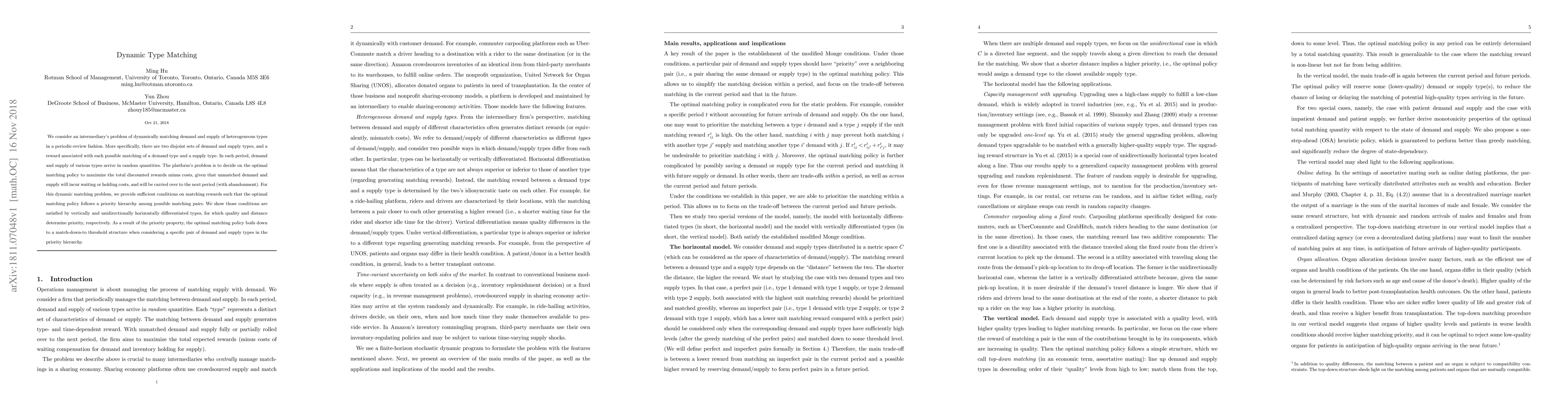 We consider an intermediary's problem of dynamically matching demand and supply of heterogeneous types in a periodic-review fashion. More specifically, there are two disjoint sets of demand and supply types, and a reward associated with each possible matching of a demand type and a supply type. In each period, demand and supply of various types arrive in random quantities. The platform's problem is to decide on the optimal matching policy to maximize the total discounted rewards minus costs, given that unmatched demand and supply will incur waiting or holding costs, and will be carried over to the next period (with abandonment). For this dynamic matching problem, we provide sufficient conditions on matching rewards such that the optimal matching policy follows a priority hierarchy among possible matching pairs. We show those conditions are satisfied by vertically and unidirectionally horizontally differentiated types, for which quality and distance determine priority, respectively. As a result of the priority property, the optimal matching policy boils down to a match-down-to threshold structure when considering a specific pair of demand and supply types in the priority hierarchy.