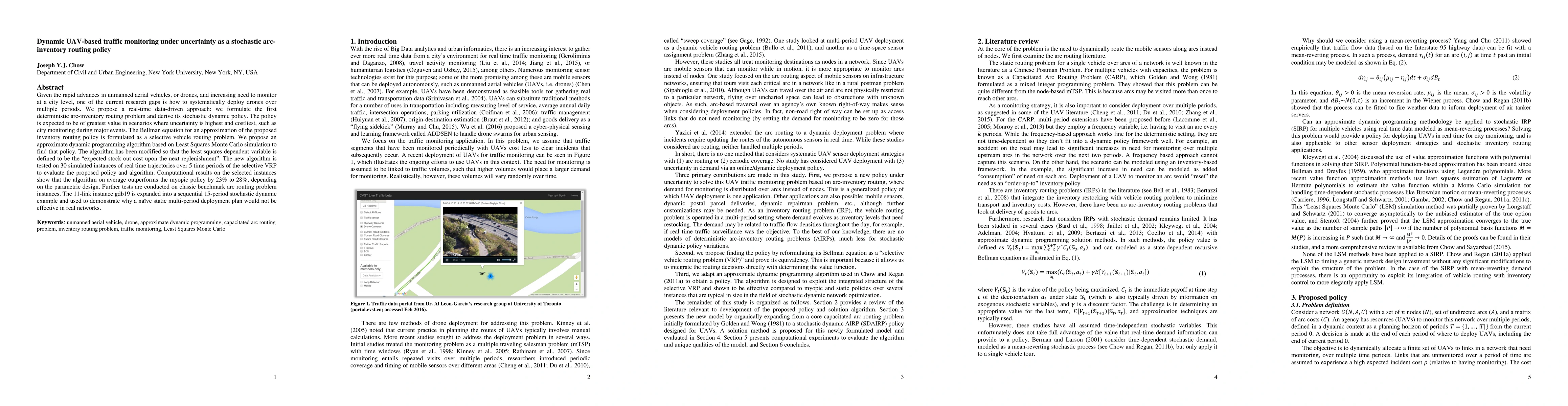 Given the rapid advances in unmanned aerial vehicles, or drones, and increasing need to monitor traffic at a city level, one of the current research gaps is how to systematically deploy drones over multiple periods. We propose a real-time data-driven approach: we formulate the first deterministic arc-inventory routing problem and derive its stochastic dynamic policy. The policy is expected to be of greatest value in scenarios where uncertainty is highest and costliest, such as city traffic monitoring during major events. The Bellman equation for an approximation of the proposed inventory routing policy is formulated as a selective vehicle routing problem. We propose an approximate dynamic programming algorithm based on Least Squares Monte Carlo simulation to find that policy. The algorithm has been modified so that the least squares dependent variable is defined to be the "expected stock out cost upon the next replenishment". The new algorithm is tested on 30 simulated instances of real time trajectories over 5 time periods of the selective VRP to evaluate the proposed policy and algorithm. Computational results on the selected instances show that the algorithm can outperform the myopic policy by 23% to 28% over those tests, depending on the parametric design. Further tests are conducted on classic benchmark arc routing problem instances. The 11-link instance gdb19 is expanded into a sequential 15-period stochastic dynamic example and used to demonstrate why a naive static multi-period deployment plan would not be effective in real networks.