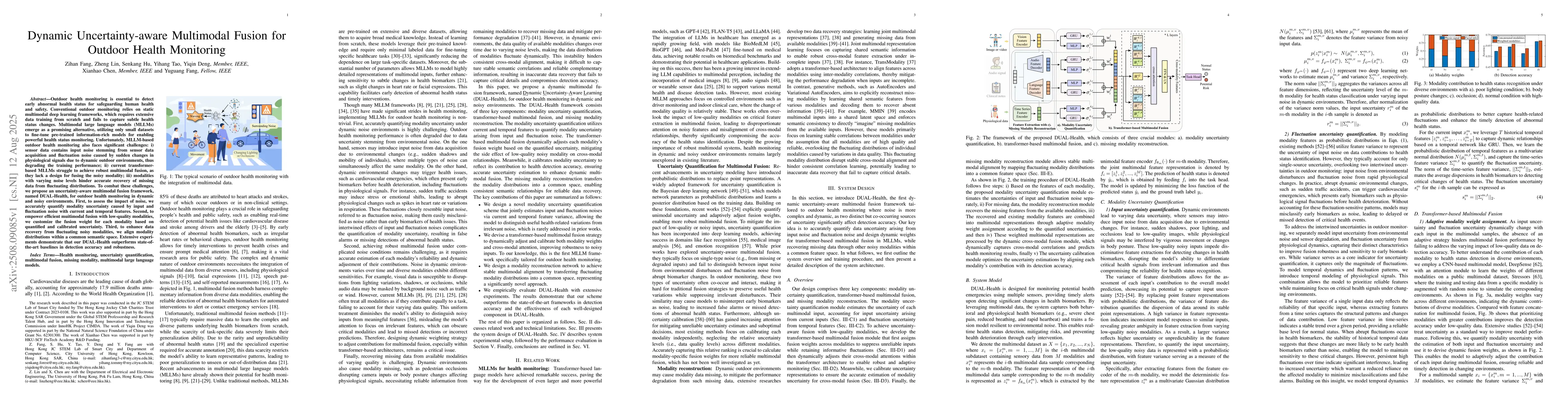 Outdoor health monitoring is essential to detect early abnormal health status for safeguarding human health and safety. Conventional outdoor monitoring relies on static multimodal deep learning frameworks, which requires extensive data training from scratch and fails to capture subtle health status changes. Multimodal large language models (MLLMs) emerge as a promising alternative, utilizing only small datasets to fine-tune pre-trained information-rich models for enabling powerful health status monitoring. Unfortunately, MLLM-based outdoor health monitoring also faces significant challenges: I) sensor data contains input noise stemming from sensor data acquisition and fluctuation noise caused by sudden changes in physiological signals due to dynamic outdoor environments, thus degrading the training performance; ii) current transformer based MLLMs struggle to achieve robust multimodal fusion, as they lack a design for fusing the noisy modality; iii) modalities with varying noise levels hinder accurate recovery of missing data from fluctuating distributions. To combat these challenges, we propose an uncertainty-aware multimodal fusion framework, named DUAL-Health, for outdoor health monitoring in dynamic and noisy environments. First, to assess the impact of noise, we accurately quantify modality uncertainty caused by input and fluctuation noise with current and temporal features. Second, to empower efficient muitimodal fusion with low-quality modalities,we customize the fusion weight for each modality based on quantified and calibrated uncertainty. Third, to enhance data recovery from fluctuating noisy modalities, we align modality distributions within a common semantic space. Extensive experiments demonstrate that our DUAL-Health outperforms state-of-the-art baselines in detection accuracy and robustness.