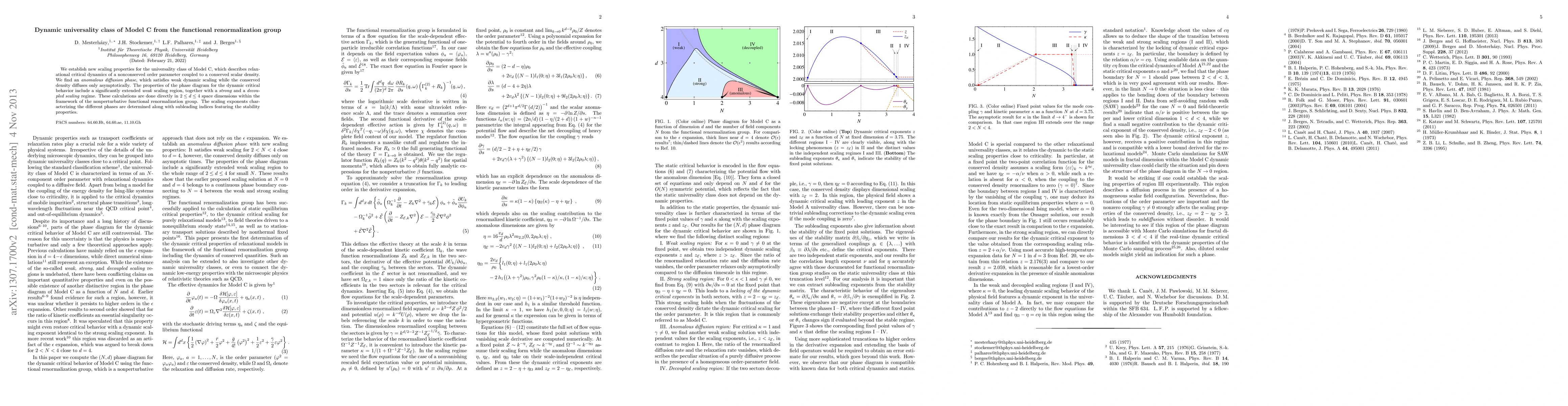 This paper establishes new scaling properties for Model C's universality class using the functional renormalization group, revealing an anomalous diffusion phase with weak dynamic scaling. The study identifies extended weak scaling regions and distinct scaling regimes in 2 < d < 4 dimensions, determining scaling exponents and stability properties.