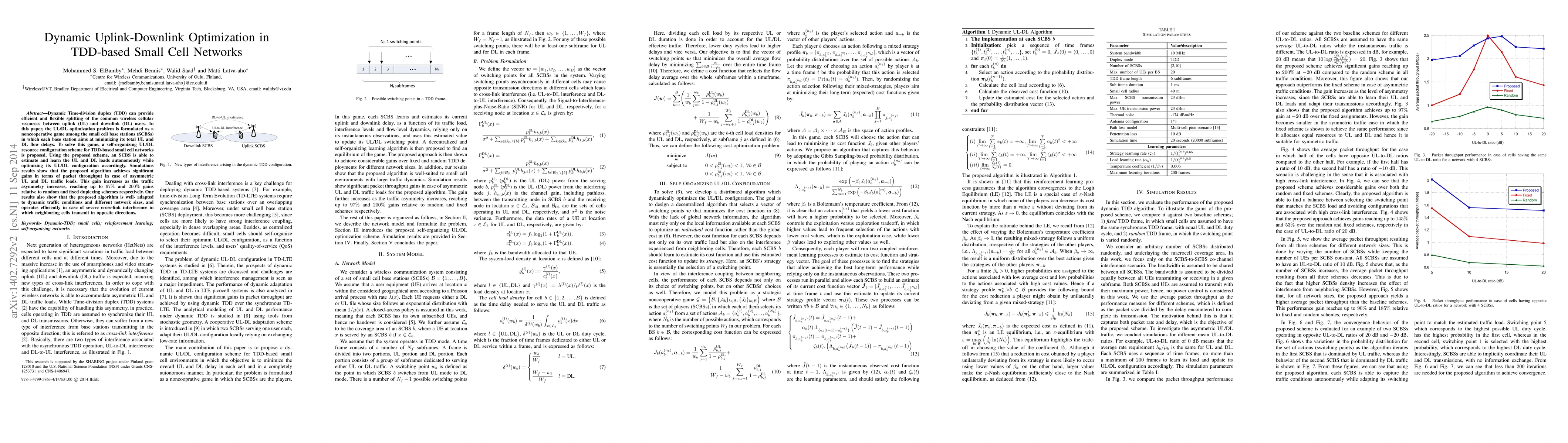 This paper proposes a self-organizing scheme for optimizing uplink-downlink resource allocation in TDD-based small cell networks through a noncooperative game. The algorithm achieves significant throughput gains, especially under asymmetric traffic conditions, and efficiently handles dynamic traffic and interference.