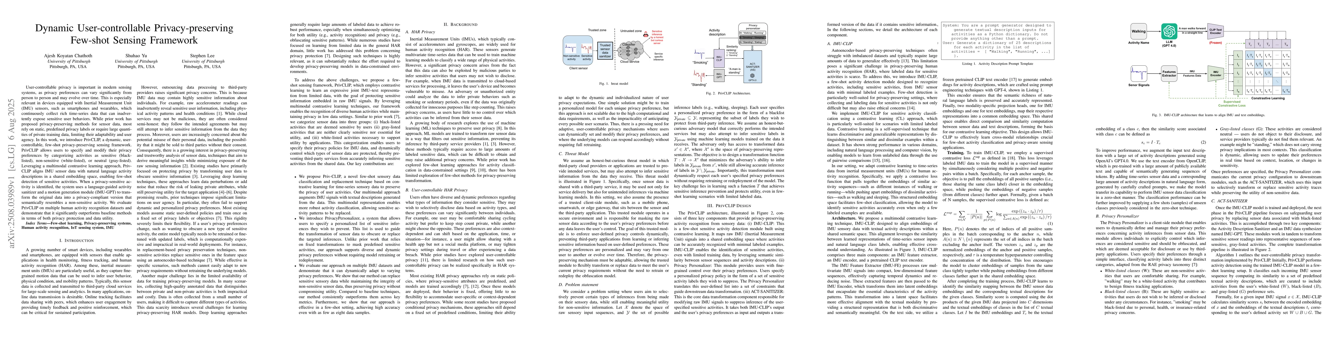 User-controllable privacy is important in modern sensing systems, as privacy preferences can vary significantly from person to person and may evolve over time. This is especially relevant in devices equipped with Inertial Measurement Unit (IMU) sensors, such as smartphones and wearables, which continuously collect rich time-series data that can inadvertently expose sensitive user behaviors. While prior work has proposed privacy-preserving methods for sensor data, most rely on static, predefined privacy labels or require large quantities of private training data, limiting their adaptability and user agency. In this work, we introduce PrivCLIP, a dynamic, user-controllable, few-shot privacy-preserving sensing framework. PrivCLIP allows users to specify and modify their privacy preferences by categorizing activities as sensitive (black-listed), non-sensitive (white-listed), or neutral (gray-listed). Leveraging a multimodal contrastive learning approach, PrivCLIP aligns IMU sensor data with natural language activity descriptions in a shared embedding space, enabling few-shot detection of sensitive activities. When a privacy-sensitive activity is identified, the system uses a language-guided activity sanitizer and a motion generation module (IMU-GPT) to transform the original data into a privacy-compliant version that semantically resembles a non-sensitive activity. We evaluate PrivCLIP on multiple human activity recognition datasets and demonstrate that it significantly outperforms baseline methods in terms of both privacy protection and data utility.
