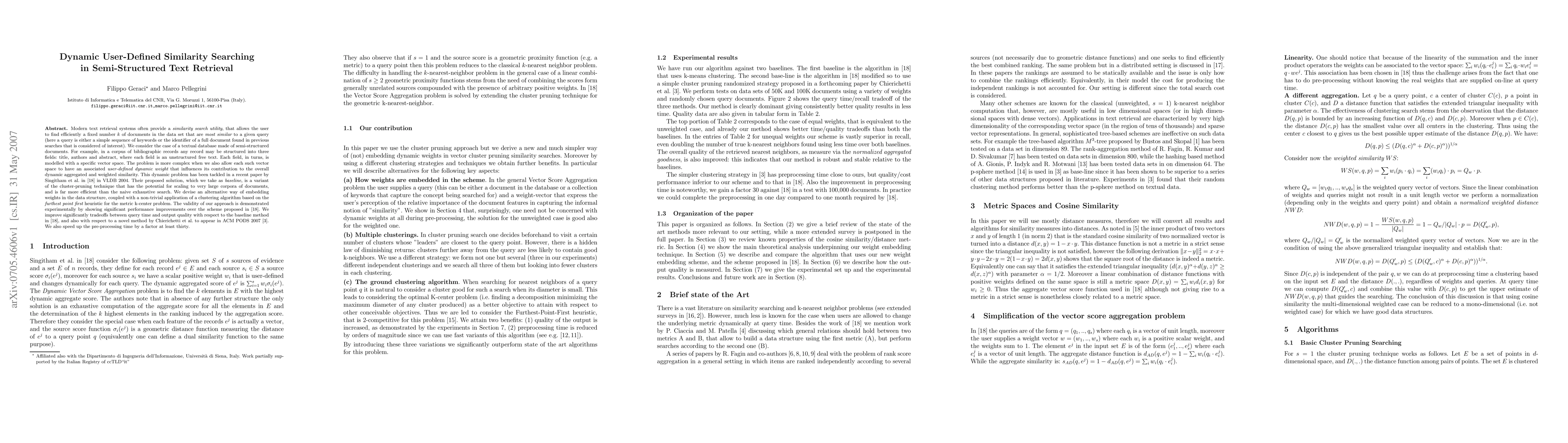 Modern text retrieval systems often provide a similarity search utility, that allows the user to find efficiently a fixed number k of documents in the data set that are most similar to a given query (here a query is either a simple sequence of keywords or the identifier of a full document found in previous searches that is considered of interest). We consider the case of a textual database made of semi-structured documents. Each field, in turns, is modelled with a specific vector space. The problem is more complex when we also allow each such vector space to have an associated user-defined dynamic weight that influences its contribution to the overall dynamic aggregated and weighted similarity. This dynamic problem has been tackled in a recent paper by Singitham et al. in in VLDB 2004. Their proposed solution, which we take as baseline, is a variant of the cluster-pruning technique that has the potential for scaling to very large corpora of documents, and is far more efficient than the naive exhaustive search. We devise an alternative way of embedding weights in the data structure, coupled with a non-trivial application of a clustering algorithm based on the furthest point first heuristic for the metric k-center problem. The validity of our approach is demonstrated experimentally by showing significant performance improvements over the scheme proposed in Singitham et al. in VLDB 2004. We improve significantly tradeoffs between query time and output quality with respect to the baseline method in Singitham et al. in in VLDB 2004, and also with respect to a novel method by Chierichetti et al. to appear in ACM PODS 2007. We also speed up the pre-processing time by a factor at least thirty.