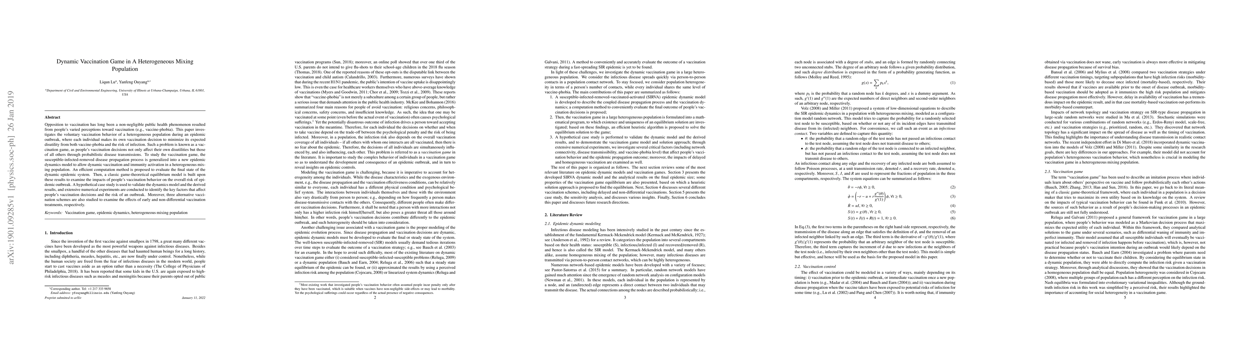 This paper models voluntary vaccination behavior in a heterogeneous population using a dynamic game framework, incorporating a generalized epidemic dynamics model to assess the impact of vaccination decisions on disease spread and outbreak risk. Numerical experiments and case studies identify key factors influencing vaccination choices and the effectiveness of different vaccination strategies.