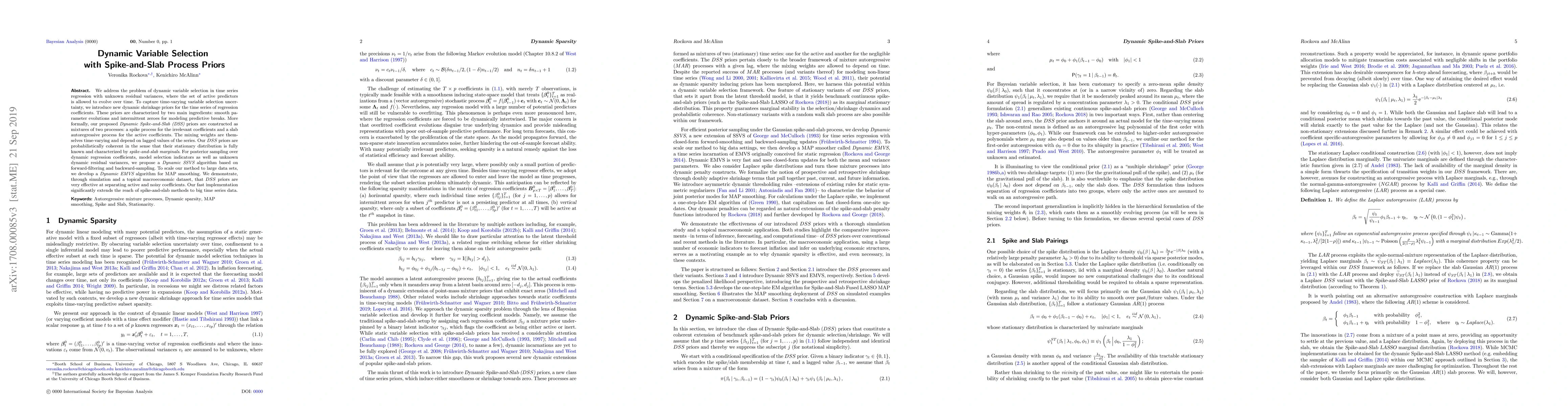 This paper proposes Dynamic Spike-and-Slab (DSS) priors for dynamic variable selection in time series regression, allowing active predictors to change over time. The DSS priors combine spike processes for irrelevant coefficients and slab autoregressive processes for active ones, enabling smooth evolution and intermittent zeroes. The authors introduce a Dynamic SSVS algorithm and a Dynamic EMVS algorithm for efficient posterior sampling and scaling to large datasets.