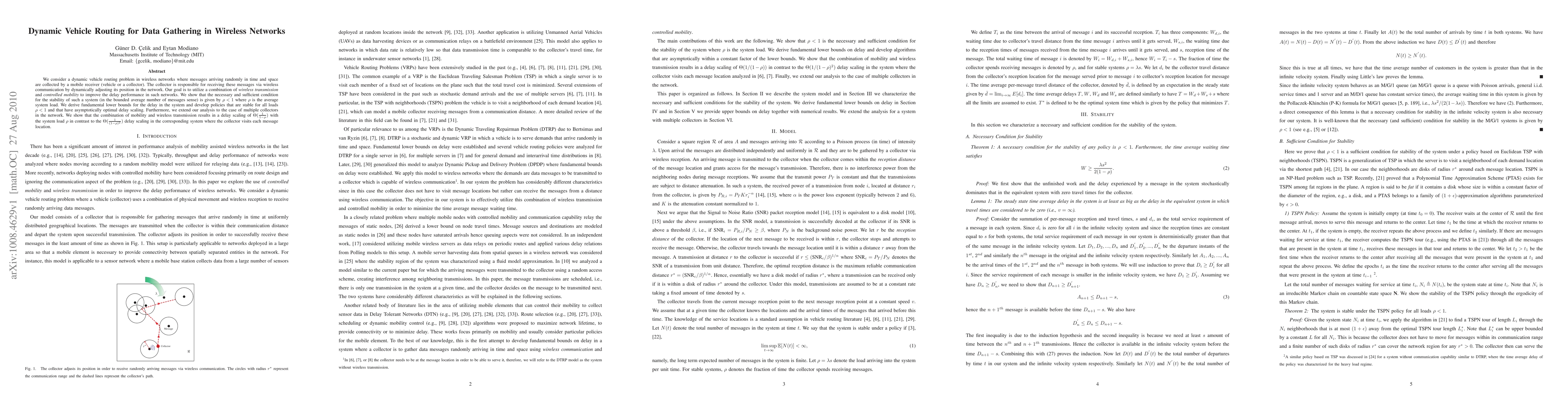 We consider a dynamic vehicle routing problem in wireless networks where messages arriving randomly in time and space are collected by a mobile receiver (vehicle or a collector). The collector is responsible for receiving these messages via wireless communication by dynamically adjusting its position in the network. Our goal is to utilize a combination of wireless transmission and controlled mobility to improve the delay performance in such networks. We show that the necessary and sufficient condition for the stability of such a system (in the bounded average number of messages sense) is given by {\rho}<1 where {\rho} is the average system load. We derive fundamental lower bounds for the delay in the system and develop policies that are stable for all loads {\rho}<1 and that have asymptotically optimal delay scaling. Furthermore, we extend our analysis to the case of multiple collectors in the network. We show that the combination of mobility and wireless transmission results in a delay scaling of {\Theta}(1/(1- {\rho})) with the system load {\rho} that is a factor of {\Theta}(1/(1- {\rho})) smaller than the delay scaling in the corresponding system where the collector visits each message location.