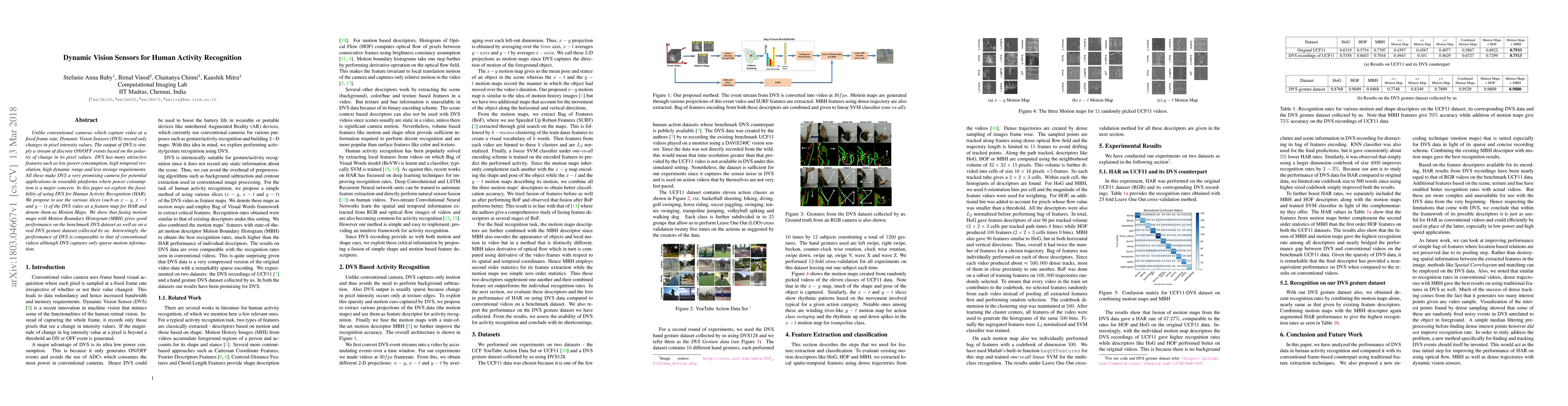 This paper explores using Dynamic Vision Sensors for human activity recognition, finding comparable performance to conventional cameras despite capturing only sparse motion information.