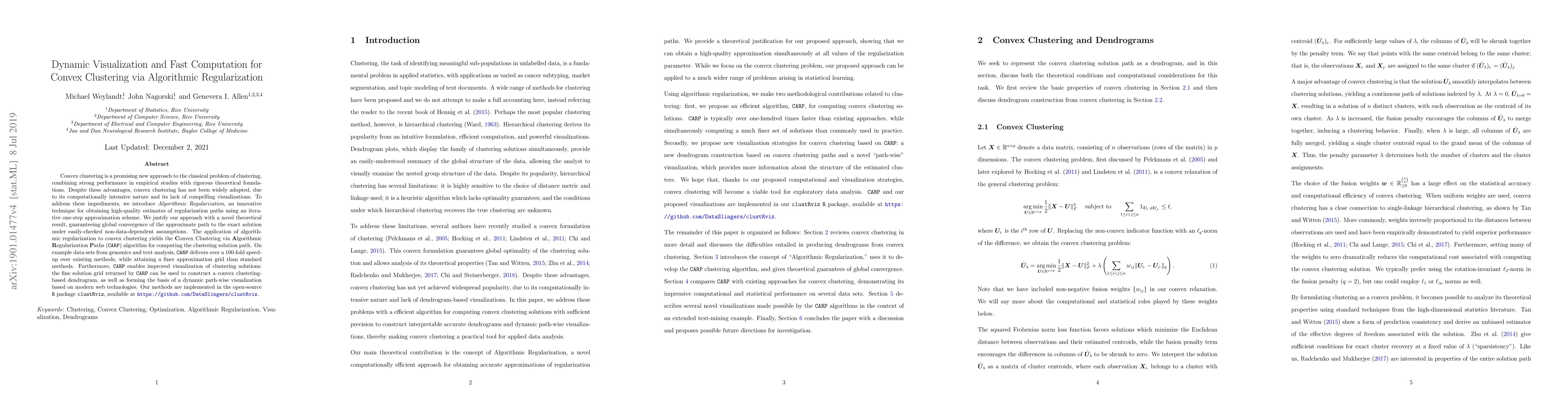 This paper introduces Algorithmic Regularization to accelerate convex clustering, resulting in the CARP algorithm that offers a 100-fold speed-up over existing methods while maintaining high-quality clustering solutions. It also enables dynamic visualizations for better interpretation of clustering results.
