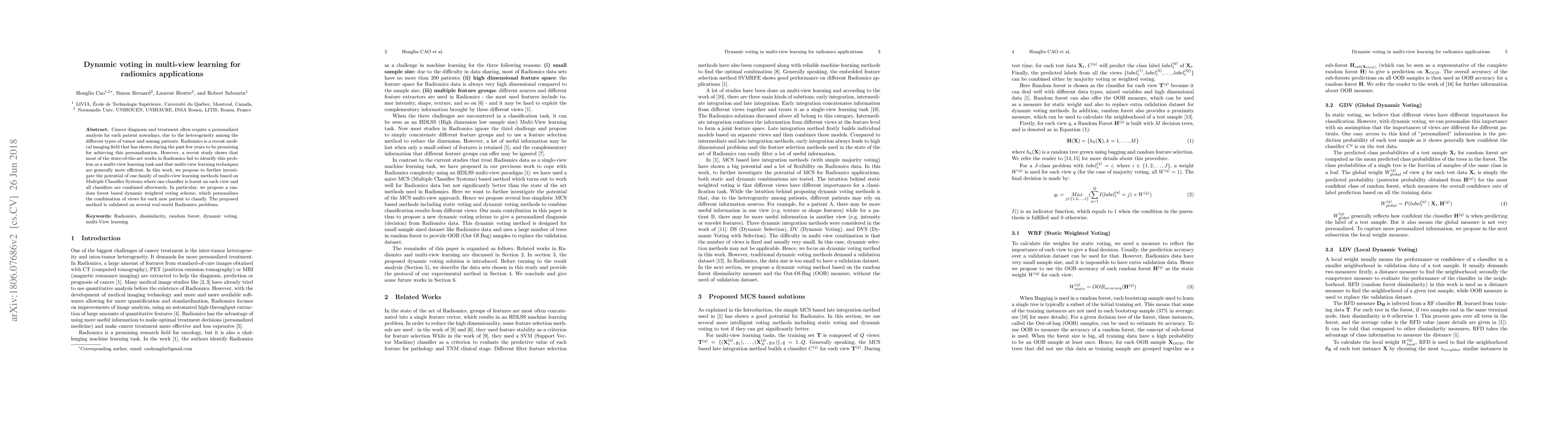 Researchers propose a dynamic voting scheme for multi-view learning in radiomics, improving personalized cancer diagnosis and treatment. Their method achieves better results than existing approaches by combining individual views with weights tailored to each patient.