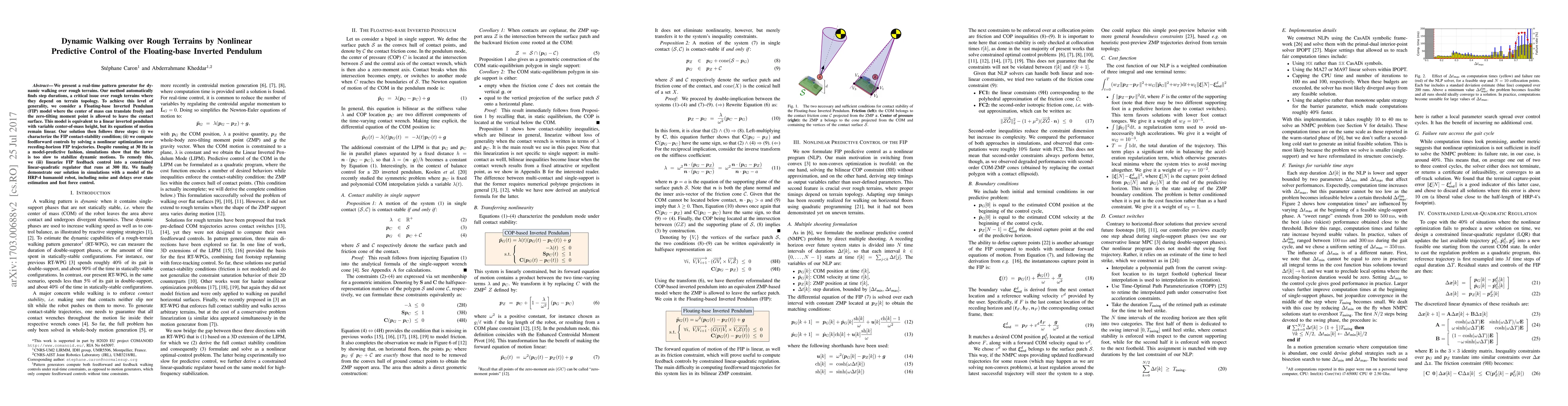 We present a real-time pattern generator for dynamic walking over rough terrains. Our method automatically finds step durations, a critical issue over rough terrains where they depend on terrain topology. To achieve this level of generality, we consider a Floating-base Inverted Pendulum (FIP) model where the center of mass can translate freely and the zero-tilting moment point is allowed to leave the contact surface. This model is equivalent to a linear inverted pendulum with variable center-of-mass height, but its equations of motion remain linear. Our solution then follows three steps: (i) we characterize the FIP contact-stability condition; (ii) we compute feedforward controls by solving a nonlinear optimization over receding-horizon FIP trajectories. Despite running at 30 Hz in a model-predictive fashion, simulations show that the latter is too slow to stabilize dynamic motions. To remedy this, we (iii) linearize FIP feedback control into a constrained linear-quadratic regulator that runs at 300 Hz. We finally demonstrate our solution in simulations with a model of the HRP-4 humanoid robot, including noise and delays over state estimation and foot force control.