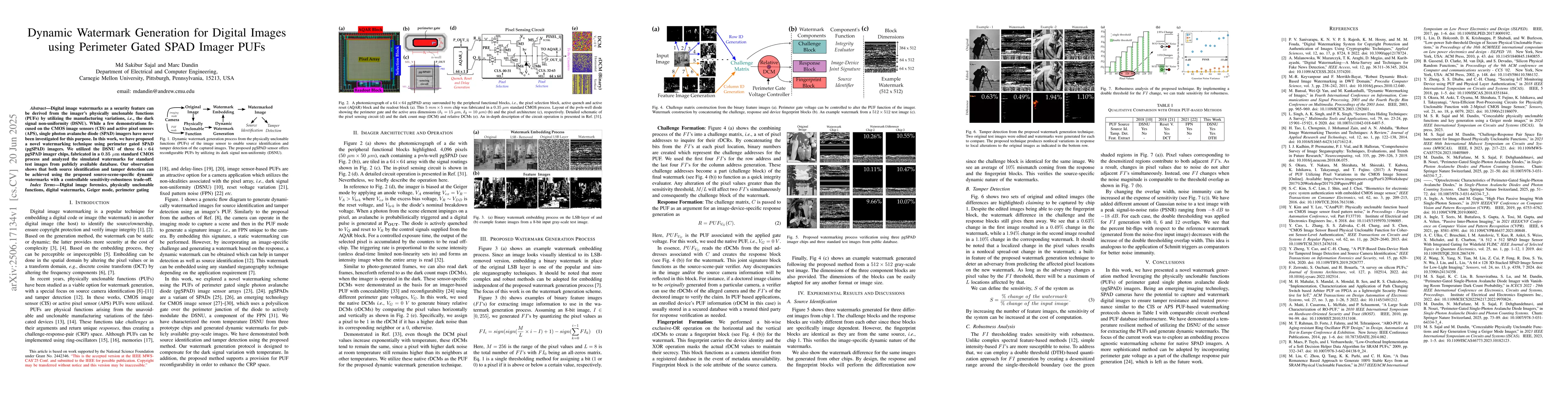 Digital image watermarks as a security feature can be derived from the imager's physically unclonable functions (PUFs) by utilizing the manufacturing variations, i.e., the dark signal non-uniformity (DSNU). While a few demonstrations focused on the CMOS image sensors (CIS) and active pixel sensors (APS), single photon avalanche diode (SPAD) imagers have never been investigated for this purpose. In this work, we have proposed a novel watermarking technique using perimeter gated SPAD (pgSPAD) imagers. We utilized the DSNU of three 64 x 64 pgSPAD imager chips, fabricated in a 0.35 {\mu}m standard CMOS process and analyzed the simulated watermarks for standard test images from publicly available database. Our observation shows that both source identification and tamper detection can be achieved using the proposed source-scene-specific dynamic watermarks with a controllable sensitivity-robustness trade-off.