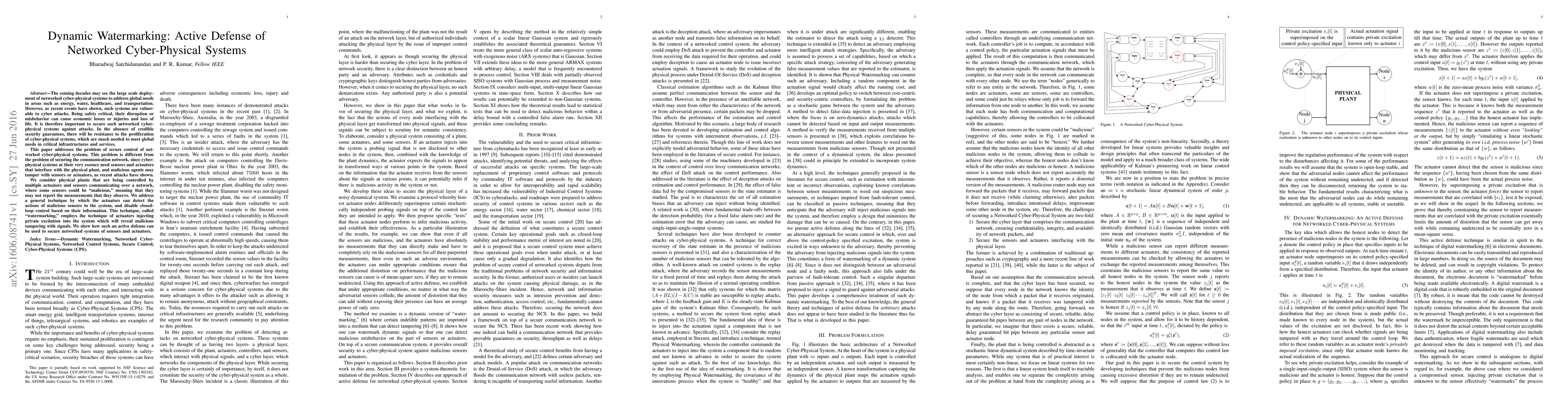 This paper proposes a dynamic watermarking technique to secure networked cyber-physical systems against attacks by detecting and mitigating malicious sensors. The method uses actuators to inject private signals into the system, enabling the identification of tampered measurements and enabling active defense against cyber threats.