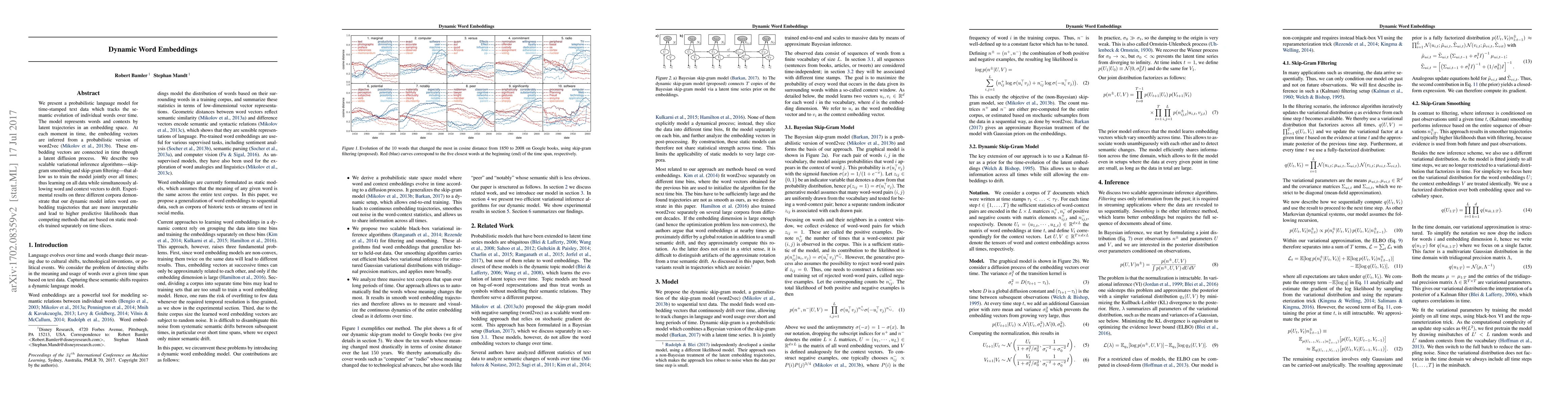 This paper introduces a probabilistic language model for time-stamped text data, tracking the semantic evolution of words through latent trajectories in an embedding space. It employs scalable variational inference algorithms for training and demonstrates improved interpretability and predictive performance compared to static models.
