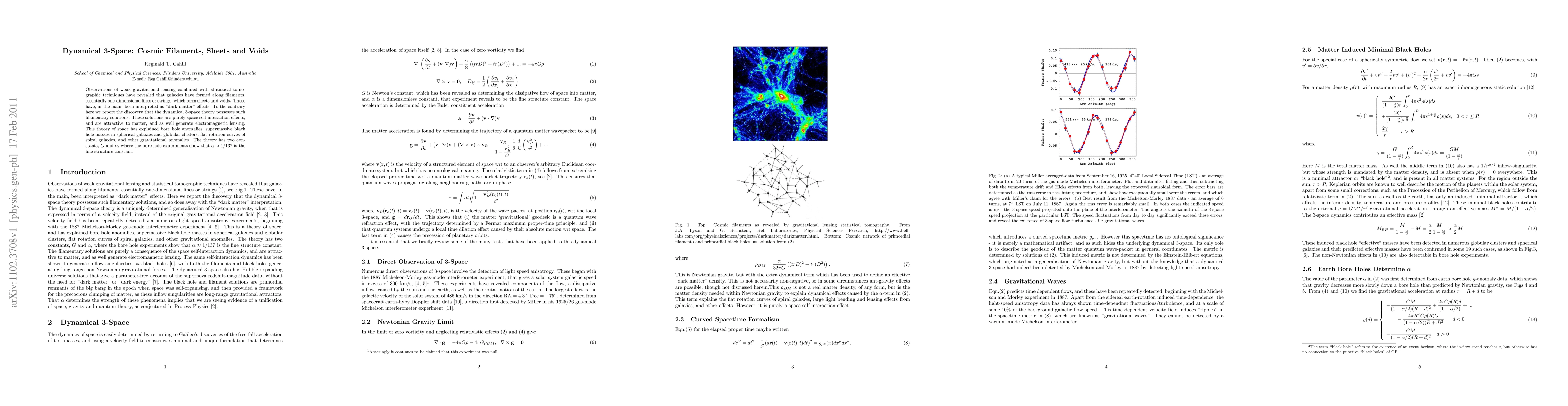 Observations of weak gravitational lensing combined with statistical tomographic techniques have revealed that galaxies have formed along filaments, essentially one-dimensional lines or strings, which form sheets and voids. These have, in the main, been interpreted as "dark matter" effects. To the contrary here we report the discovery that the dynamical 3-space theory possesses such filamentary solutions. These solutions are purely space self-interaction effects, and are attractive to matter, and as well generate electromagnetic lensing. This theory of space has explained bore hole anomalies, supermassive black hole masses in spherical galaxies and globular clusters, flat rotation curves of spiral galaxies, and other gravitational anomalies. The theory has two constants, G and alpha, where the bore hole experiments show that alpha approx 1/137 is the fine structure constant.
