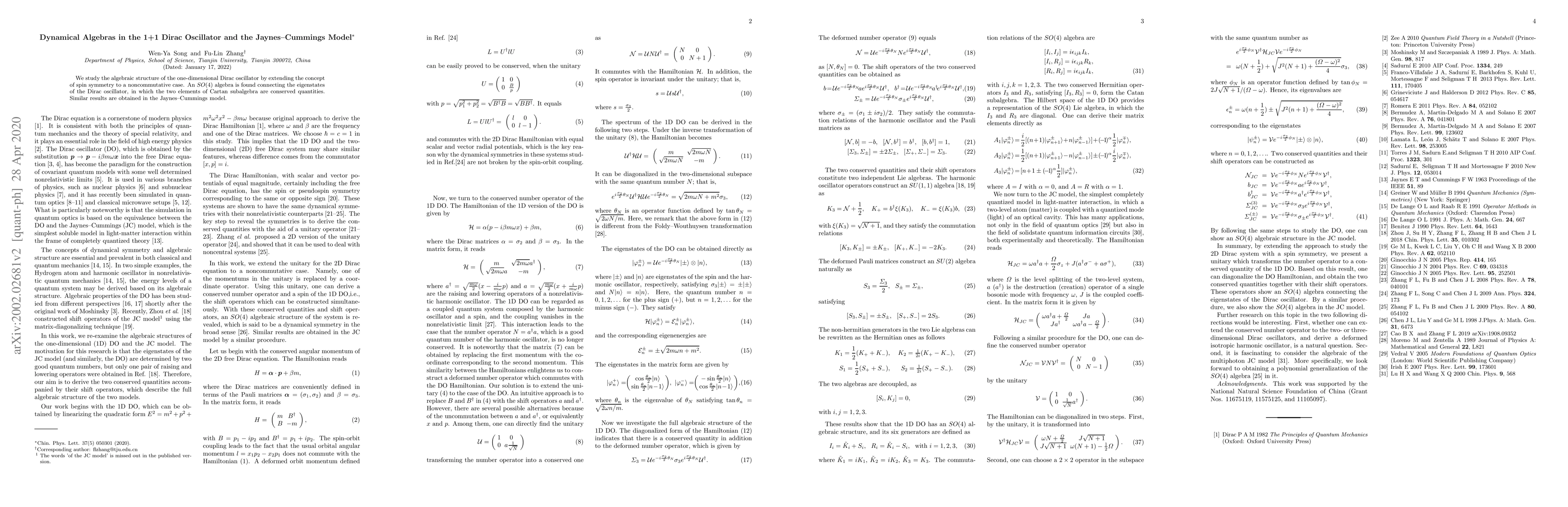 We study the algebraic structure of the one-dimensional Dirac oscillator by extending the concept of spin symmetry to a noncommutative case. An SO(4) algebra is found connecting the eigenstates of the Dirac oscillator, in which the two elements of Cartan subalgebra are conserved quantities. Similar results are obtained in the Jaynes--Cummings model.