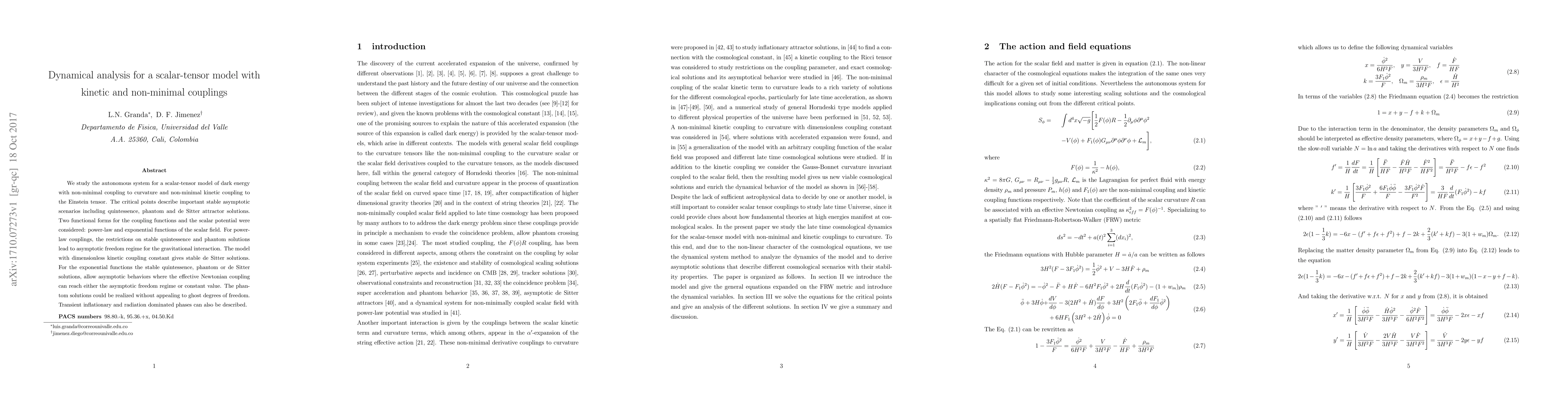 We study the autonomous system for a scalar-tensor model of dark energy with non-minimal coupling to curvature and non-minimal kinetic coupling to the Einstein tensor. The critical points describe important stable asymptotic scenarios including quintessence, phantom and de Sitter attractor solutions. Two functional forms for the coupling functions and the scalar potential were considered: power-law and exponential functions of the scalar field. For power-law couplings, the restrictions on stable quintessence and phantom solutions lead to asymptotic freedom regime for the gravitational interaction. The model with dimensionless kinetic coupling constant gives stable de Sitter solutions. For the exponential functions the stable quintessence, phantom or de Sitter solutions, allow asymptotic behaviors where the effective Newtonian coupling can reach either the asymptotic freedom regime or constant value. The phantom solutions could be realized without appealing to ghost degrees of freedom. Transient inflationary and radiation dominated phases can also be described.