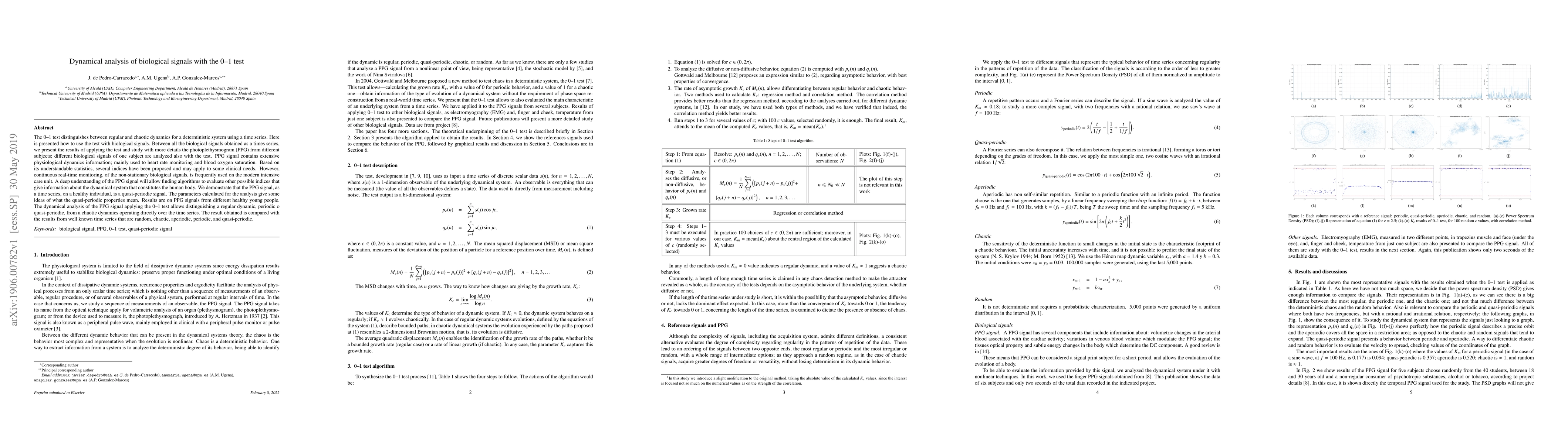 The 0-1 test distinguishes between regular and chaotic dynamics for a deterministic system using a time series. Here is presented how to use the test with biological signals. Between all the biological signals obtained as a times series, we present the results of applying the test and study with more details the photoplethysmogram (PPG) from different subjects; different biological signals of one subject are analyzed also with the test. PPG signal contains extensive physiological dynamics information; mainly used to heart rate monitoring and blood oxygen saturation. Based on its understandable statistics, several indices have been proposed and may apply to some clinical needs. However, continuous real-time monitoring, of the non-stationary biological signals, is frequently used on the modern intensive care unit. A deep understanding of the PPG signal will allow finding algorithms to evaluate other possible indices that give information about the dynamical system that constitutes the human body. We demonstrate that the PPG signal, as a time series, on a healthy individual, is a quasi-periodic signal. The parameters calculated for the analysis give some ideas of what the quasi-periodic properties mean. Results are on PPG signals from different healthy young people. The dynamical analysis of the PPG signal applying the 0-1 test allows distinguishing a regular dynamic, periodic o quasi-periodic, from a chaotic dynamics operating directly over the time series. The result obtained is compared with the results from well known time series that are random, chaotic, aperiodic, periodic, and quasi-periodic.