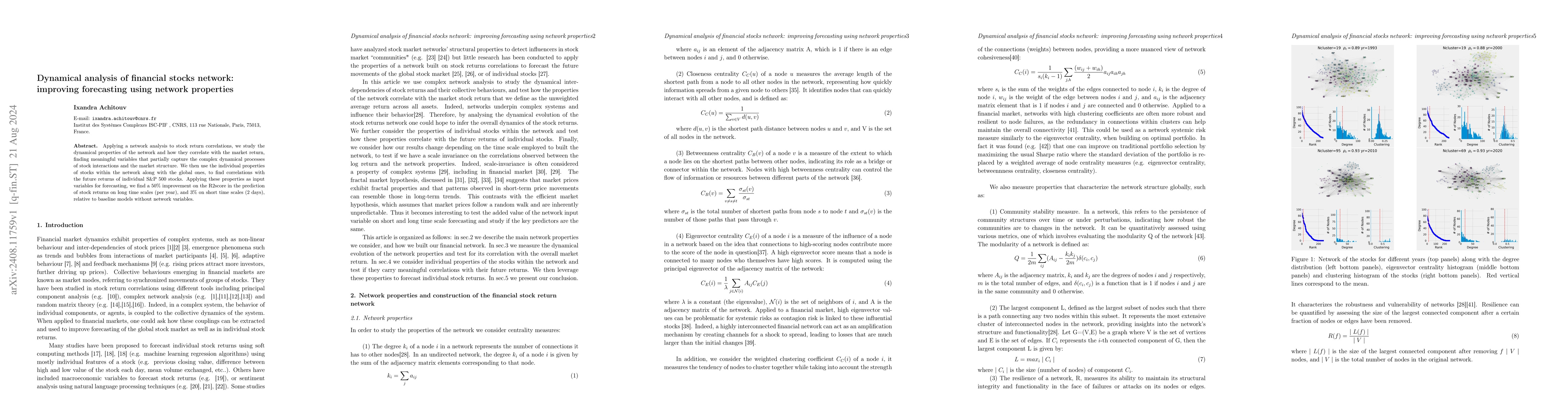 This paper employs network analysis on stock return correlations to identify dynamical network properties correlating with market returns. It utilizes both individual and global network properties to predict S&P 500 stock returns, achieving a 50% improvement in long-term (annual) R2 score and a 3% improvement in short-term (2 days) forecasts compared to baseline models.