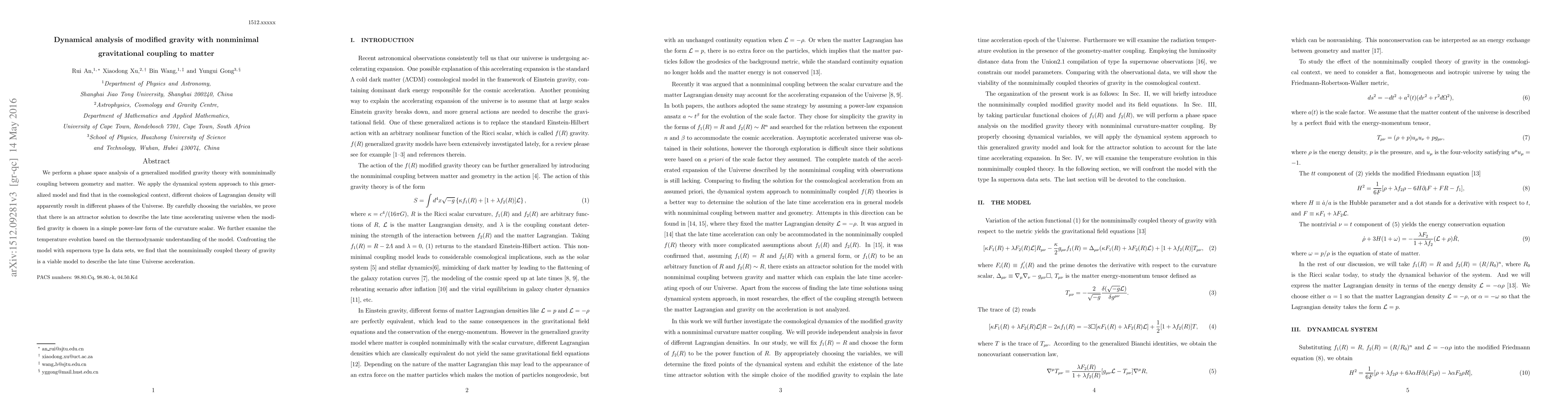 We perform a phase space analysis of a generalized modified gravity theory with nonminimally coupling between geometry and matter. We apply the dynamical system approach to this generalized model and find that in the cosmological context, different choices of Lagrangian density will apparently result in different phases of the Universe. By carefully choosing the variables, we prove that there is an attractor solution to describe the late time accelerating universe when the modified gravity is chosen in a simple power-law form of the curvature scalar. We further examine the temperature evolution based on the thermodynamic understanding of the model. Confronting the model with supernova type Ia data sets, we find that the nonminimally coupled theory of gravity is a viable model to describe the late time Universe acceleration.