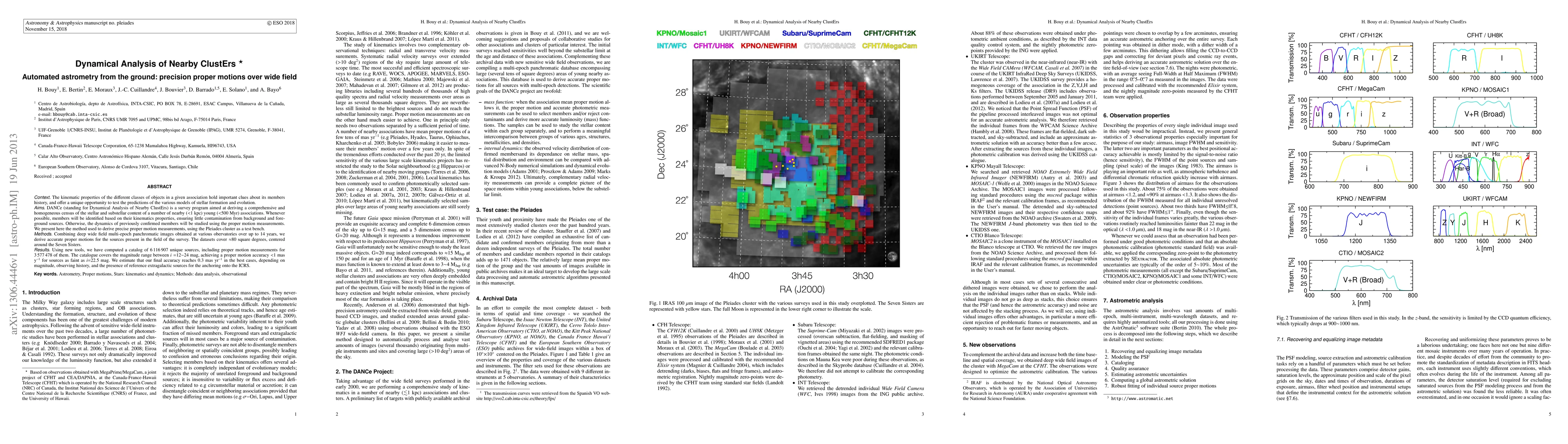 The kinematic properties of the different classes of objects in a given association hold important clues about its member's history, and offer a unique opportunity to test the predictions of the various models of stellar formation and evolution. DANCe (standing for Dynamical Analysis of Nearby ClustErs) is a survey program aimed at deriving a comprehensive and homogeneous census of the stellar and substellar content of a number of nearby (<1kpc) young (<500Myr) associations. Whenever possible, members will be identified based on their kinematics properties, ensuring little contamination from background and foreground sources. Otherwise, the dynamics of previously confirmed members will be studied using the proper motion measurements. We present here the method used to derive precise proper motion measurements, using the Pleiades cluster as a test bench. Combining deep wide field multi-epoch panchromatic images obtained at various obervatories over up to 14 years, we derive accurate proper motions for the sources present in the field of the survey. The datasets cover ~80 square degrees, centered around the Seven Sisters. Using new tools, we have computed a catalog of 6116907 unique sources, including proper motion measurements for 3577478 of them. The catalogue covers the magnitude range between i=12~24mag, achieving a proper motion accuracy <1mas/yr for sources as faint as i=22.5mag. We estimate that our final accuracy reaches 0.3mas/yr in the best cases, depending on magnitude, observing history, and the presence of reference extragalactic sources for the anchoring onto the ICRS.